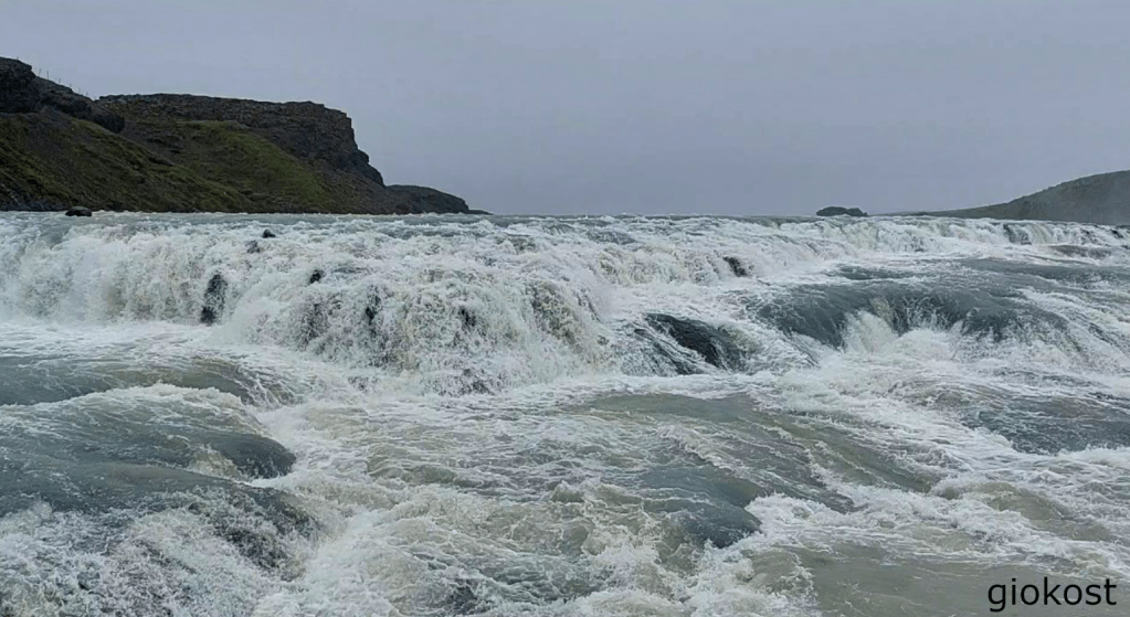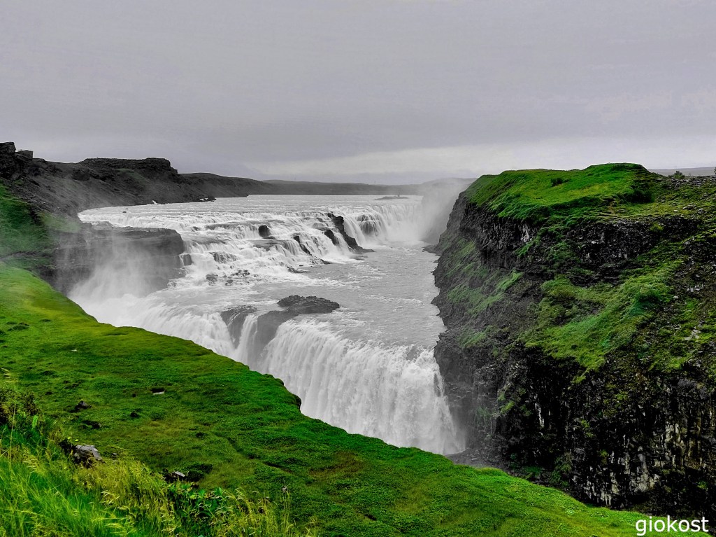 Lasciato il sito di Geysir, proseguendo sulla route 35 in pochi minuti si arriva alla cascata di Gullfoss, si parcheggia e ci si avvia lungo i sentieri che conducono alla cascata uno verso il basso e l’altro verso l’alto.