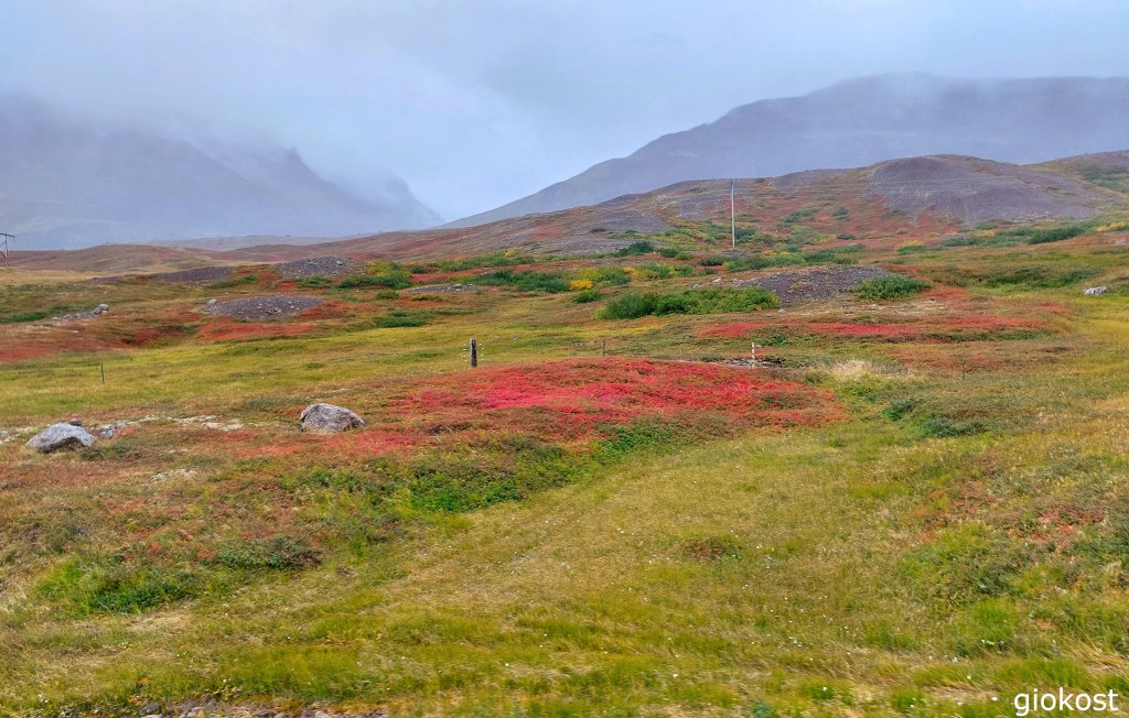 Alla fine di Settembre, che coincide con l’inizio dell’autunno, il mix di colori diventa più evidente, infatti si passa repentinamente dal verde estivo al giallastro autunnale al nero lava della strada al bianco del ghiacciaio, all’azzurro del cielo o al suo grigio quando piove, o al rosso intenso del tramonto.