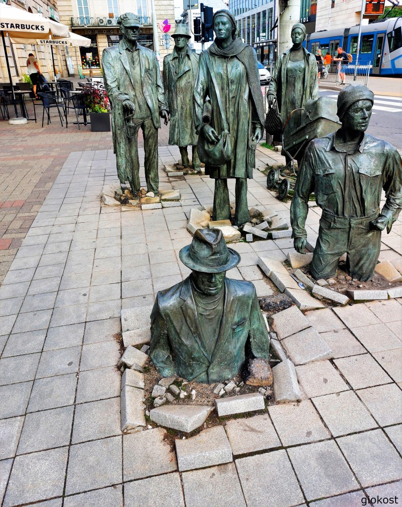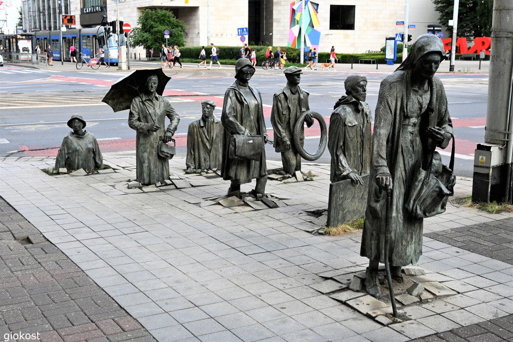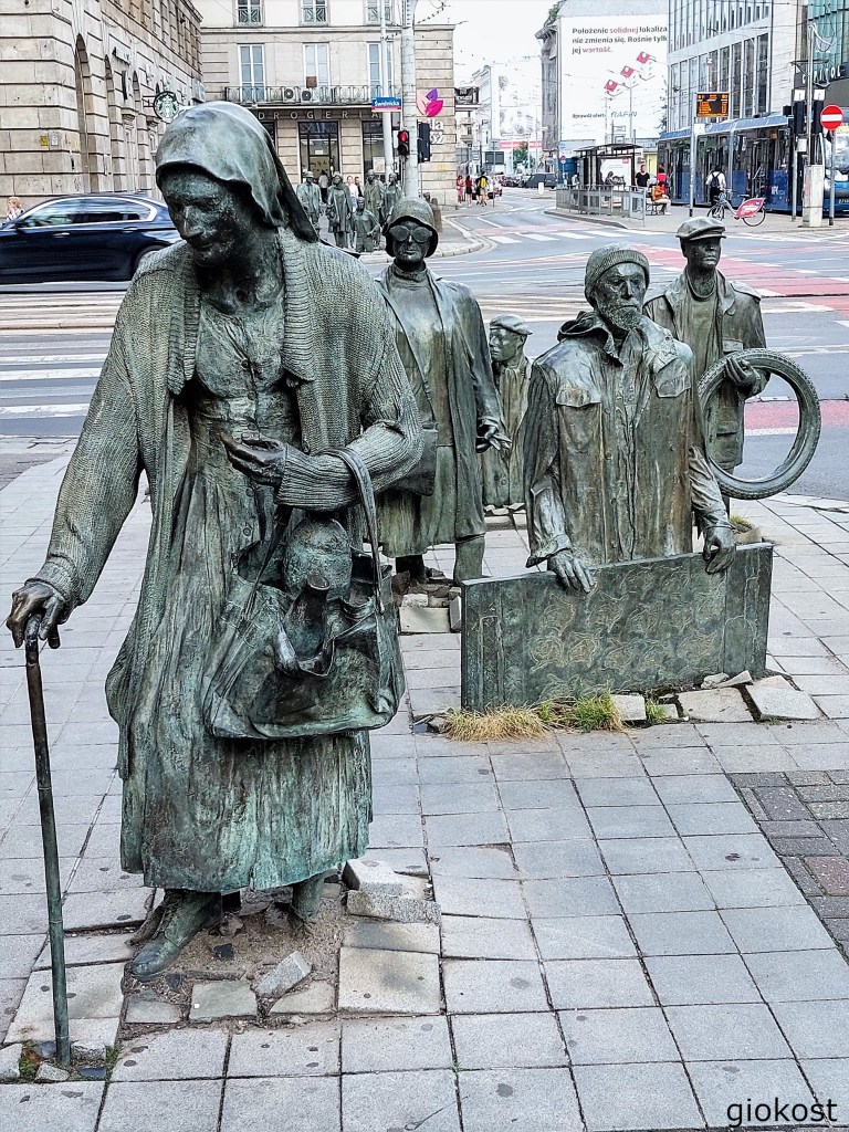 A mio parere molto più interessante è il gruppo di statue, sono 14, che si trovano all’incrocio tra ul. Świdnicka e ul. Piludskiego, disposte sui due bordi della strada. L’ autore è l’artista polacco Jerzy Kalino. le statue, a grandezza naturale, scompaiono nel marciapiede avvicinandosi al bordo della strada, l’opera è nota con il nome di “Pomnik Anonimowego Przechodnia”, cioè “Monumento del passante anonimo” oppure “Przejście”, ossia “Transizione”. Con quest’opera si vuole ricordare la scomparsa, in Polonia, di molte persone nel periodo dei primi anni Ottanta.