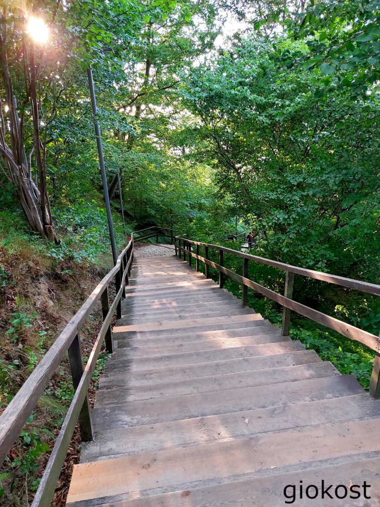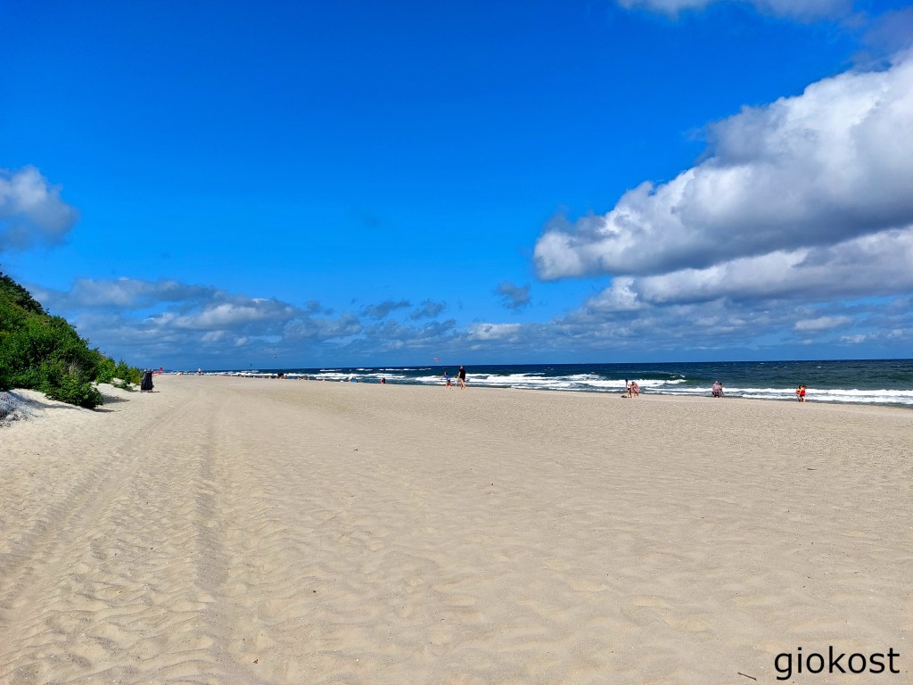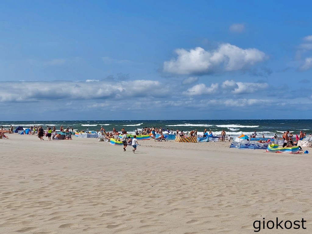 Jastrzębia Góra, è una località turistica fra le più visitate della Polonia, quasi esclusivamente frequentata da famiglie polacche, nota per la sua lunghissima spiaggia, per l’alta scogliera, davvero splendida, che la costeggia e per essere il punto più settentrionale della Polonia segnalato da un obelisco. La via centrale è Swiatowid Promenade dove si trovano caffè, ristoranti giochi per i bambini e anche un piccolo museo delle cere. Da lì si scende in spiaggia attraverso una scalinata in legno abbastanza ripida così come ce ne sono lungo tutto il sentiero, che costeggia dall’alto il lunghissimo arenile, utilizzato da molti per fare trekking. Si scende su una spiaggia ben attrezzata di sabbia finissima dove si concentra la maggior parte delle persone anche perché è lì in fondo alle scale c’è quasi sempre un piccolo bar. Un accesso più dolce alla spiaggia è quello da Droga Rybacka Street. Una volta in spiaggia se ci si allontana di alcuni metri si trovano senza difficoltà spazi isolati dove stenderti al sole. Il mare basso, poi, ti concede di sguazzare nell’acqua anche se freddina. Il vento è un’incognita costante con cui fare sempre i conti, quando soffia troppo forte i guardaspiaggia consigliano, forse meglio, costringono a non entrare, o ad uscire dall’acqua, compaiono i teli paravento o delle piccole tende da spiaggia, per ripararsi dalla sabbia sollevata, e ovviamente si chiudono gli ombrelloni. Con il vento del nord è possibile osservare i parapendii che sfruttano le correnti che salgono sulle pareti rocciose e, in acqua, chi usa il Windsurf o chi si diletta con il Kitesurfing.
