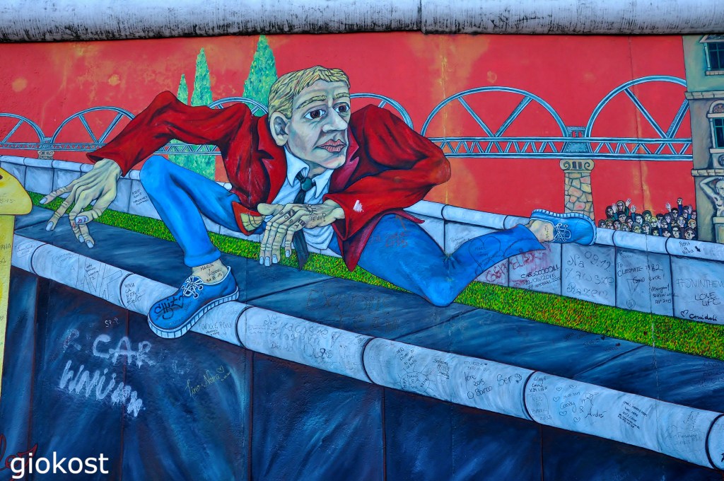 Purtroppo molto spesso sono danneggiati da inquinamento, logorio e, soprattutto, vandalismo. Ci sono anche molti altri lavori degni di menzione, tutti con un valore simbolico elevato, come ad esempio, Der Mauerspringer (il Saltatore del Muro) di Gebriel Heimler che onora tutte quelle persone che hanno tentato di scappare spesso con effetti nefasti, infatti le vittime di questi tentativi di fuga sono ricordati al Memoriale del Muro in Bernauer Straße. Altro murales molto intrigante è Ohne Titel (Senza Titolo) di Georg Lutz, Mikailh Gorbaciev che guida un’auto, nel cui volante si riconosce la falce e il martello, la strada è quella del declino dell’Unione Sovietica. Anche Alles offen (tutto aperto) di di Rosemarie Schinzler il cui significato è molto chiaro, due colombe che trasportano la Porta di Brandeburgo al posto del tipico ramoscello d’olivo è un graffito da non perdere, così come Es geschah im November (accadde in novembre) di Kani Alavi, dove una moltitudine di persone, con visi di speranza, attraversa il Checkpoint Charlie.