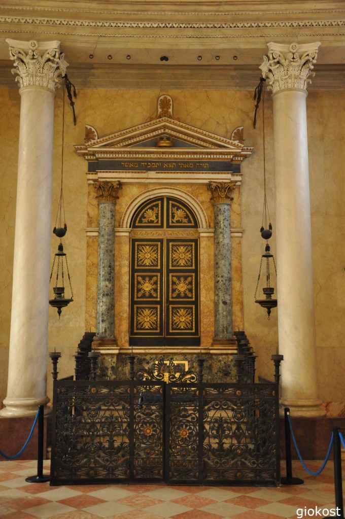 La Sinagoga è preceduta da un ampio atrio, a pianta rettangolare. L’ Arca, dov’erano custoditi i rotoli della Legge, è situata in fondo alla sala, di fronte all’ingresso, incassata nella muratura ed incorniciata da due colonnette corinzie sormontate da un timpano.