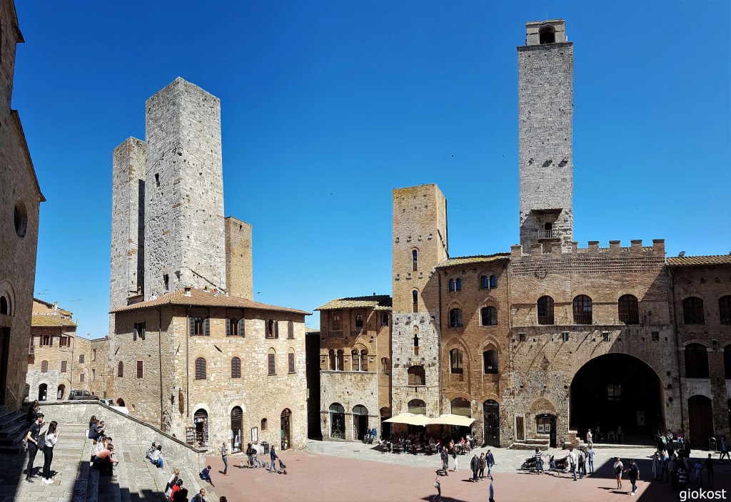 Parcheggiata l’automobile, attraverso alcuni vicoli, si arriva in Piazza Duomo, la piazza centrale, dove guardando verso l’alto si ammirano le torri più alte di San Gimignano la Torre Grossa, le due Torri gemelle, le uniche tre su cui si può salire, e la Torre Rognosa, detta anche Torre dell’Orologio, oltre al Duomo con la sua scalinata, utilizzata volentieri per una pausa ristoratrice.