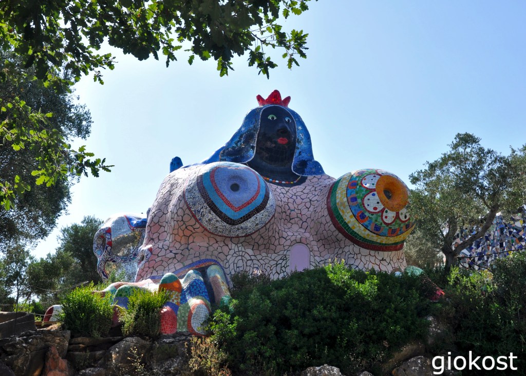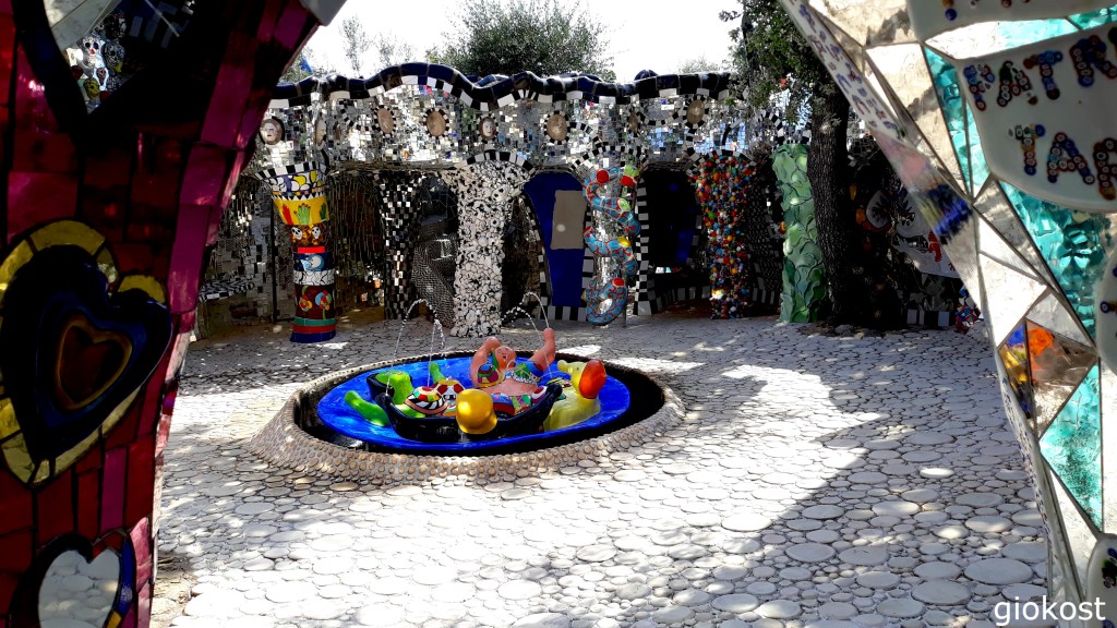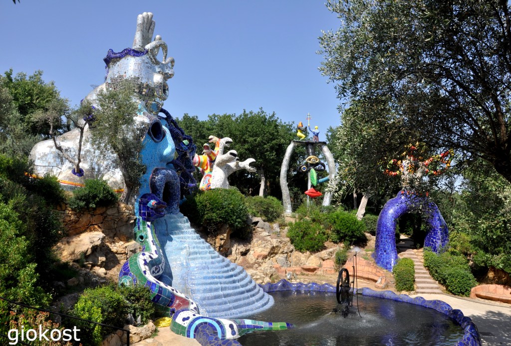 Questo parco è stato creato da Niki de Saint Phalle con l’aiuto del marito, Jean Tinguely, sposato nel 1971, e aiutata da un gruppo di operai e di artisti dell’arte contemporanea. Si tratta di un’opera che si ispira chiaramente al Parco Güell di Barcellona. Sono ventidue enormi sculture metalliche che rappresentano l’esoterismo delle carte dei tarocchi, in alcune vi si può perfino entrare, altre, invece, si muovono. La sua progettazione è iniziata nel 1979, la costruzione è durata indicativamente diciassette anni con un’enorme spesa, si dice di qualche miliardo di lire, l’apertura al pubblico avvenne nel 1998. Queste sculture, ricoperte con decorazioni di specchi, vetri e ceramiche colorate mi hanno immerso in un’atmosfera del tutto particolare, magica, incantata e spensierata che mi ha riportato indietro nel tempo a quando da bimbo giocavo a carte.