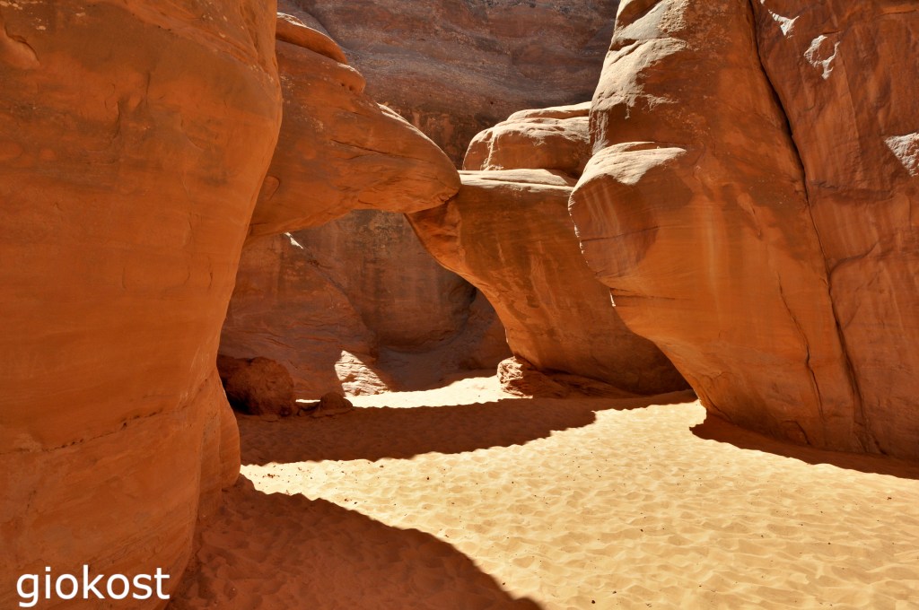 Il Sand Dune Arch è una vera e propria chicca, un arco piccolo e basso incastrato tra alte pareti di arenaria raggiungibile con un sentierino moderatamente difficoltoso perché è necessario il passaggio attraverso alcune fessure e cunicoli.