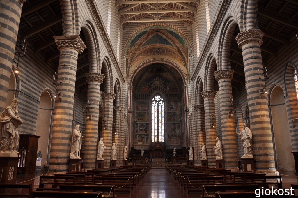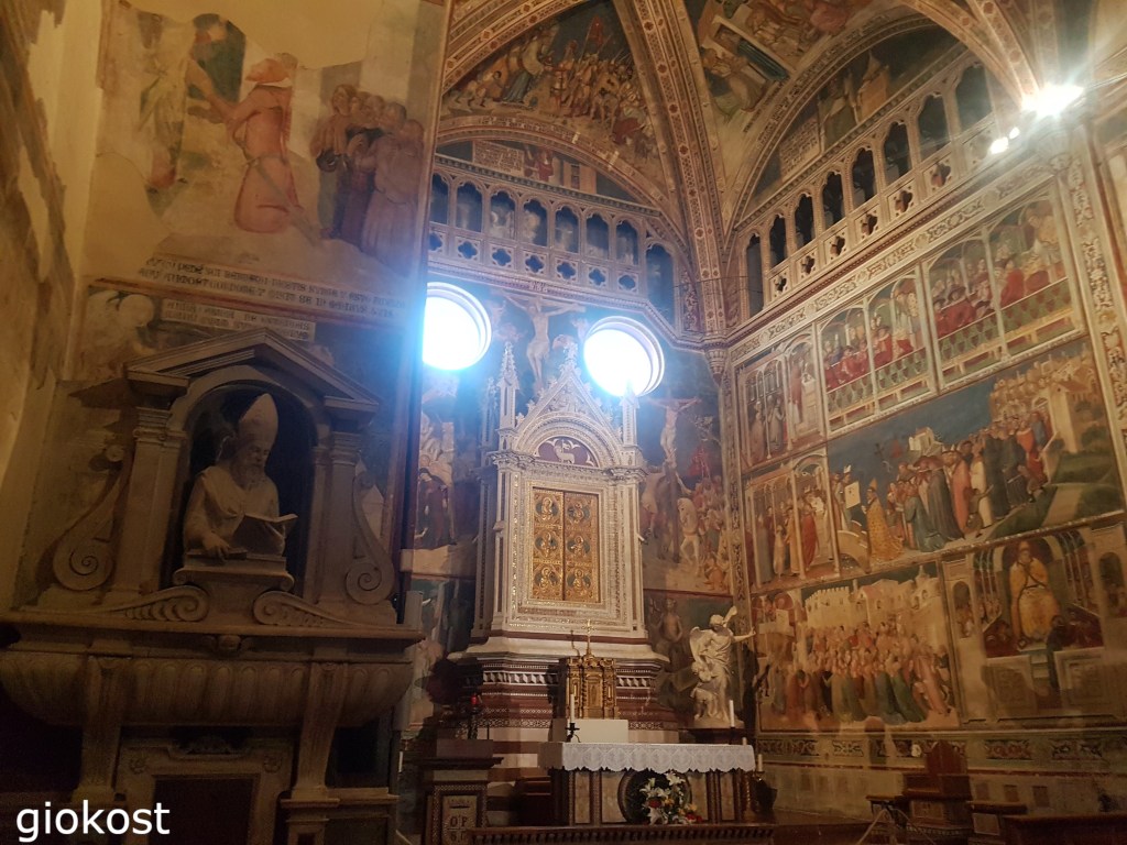 Sulla destra abbiamo la Cappella di San Brizio, detta anche Cappella Nova, eretta alla fine del milletrecento ma affrescata in anni successivi prima dal Beato Angelico, poi da Luca Signorelli che terminò il suo lavoro nei primissimi anni del millecinquecento. In questo modo si passa da uno stile tipicamente medioevale ad uno rinascimentale dentro un edificio specificatamente gotico.