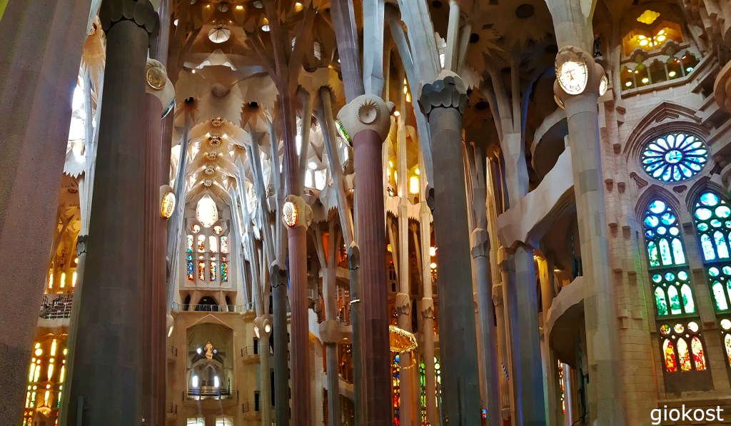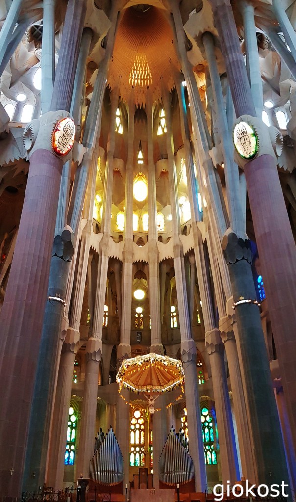Una volta entrato in chiesa son subito rimasto a bocca aperta, si intuisce lo stile naturalistico-gotico di Gaudí, sembra di essere in una foresta dove i pilastri sono gli alberi e le volte le foglie illuminate dalle grandi vetrate laterali che riflettono la luce del sole modificandone i colori che vanno dal rosso al blu passando per il verde ed il giallo, la loro ubicazione non è stata scelta a caso quelle con i colori più vivaci sono poste in basso in modo da mantenere un equilibrio della lucentezza all’interno della chiesa e permettere cosi di evidenziare anche i particolari più piccoli, una scenografia esclusiva, apprezzabile anche guardando verso l’alto.