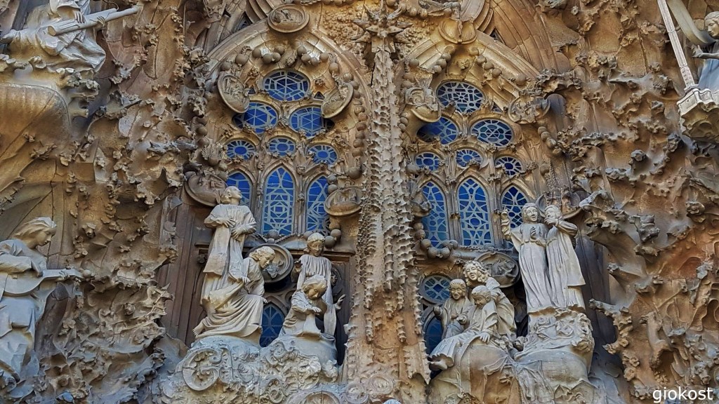 Sono entrato dalla parte della facciata della Natività, che risale al periodo tra gli anni 1894 e 1930 quindi completata prima della morte di Gaudì. Nei suoi dettagli si scopre una voglia di vita e di gioia. Divisa in tre portali a forma piramidale, che rappresentano la speranza, dedicato a Giuseppe con la rappresentazione di alcune scene della sua vita come lo sposalizio o la fuga in Egitto, la fede, dedicato alla Vergine Maria, perciò con scene dell’Immacolata concezione o della presentazione di Gesù al tempio. Infine quello centrale, la carità dedicata a Gesù e quindi con rinvii alla natività, all’adorazione dei Magi con al centro la stella cometa. Quest’ultima è sovrastata dall’albero della vita. Al di sopra di tutto si ergono quattro torri dedicate agli apostoli. Ogni portale ha una porta d’ingresso su cui si scorgono api, coccinelle, lucertole, c’è un grande impegno da parte dei turisti nel ricercarne il più possibile.