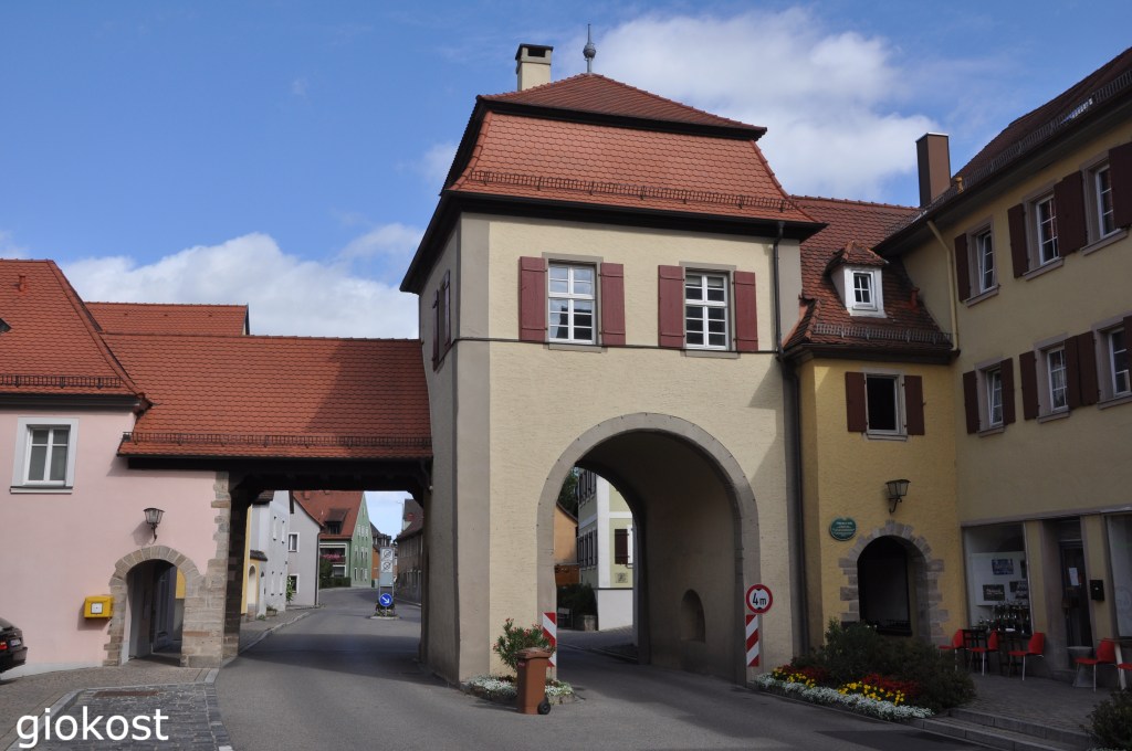 Ritornando verso Füssen mi sono fermato a Feuchtwangen, tappa di quaranta chilometri, il centro città è la Marktplatz in cui si trova la Röhrenbrunnen, una fontana costruita nella metà del millesettecento decorata con gli stemmi delle regioni del Brandeburgo e del Wurttemberg, tra questi si riconoscono uno stemma con l’abete simbolo di Feuchtwangen, al centro una colonna con la statua di Minerva. Dalla piazza attraverso una scalinata si arriva al chiostro romanico, residuo del monastero benedettino di cui si ha notizia negli anni ottocento. Venne ampliato gradualmente e trasformato in quello che oggi è la collegiata, la Stiftkirche, basta guardare i due campanili differenti tra loro. Altre differenze si trovano all’interno, in particolare tra l’altare, della fine del millequattrocento in stile gotico e il soffitto a cassettoni del periodo barocco. Di fronte la Johanniskirche, chiesa di San Giovanni, l’antica chiesa parrocchiale di Feuchtwangen, al suo interno ci sono dipinti che risalgono al millequattrocento, ma il pezzo forte è l’altare maggiore, barocco. Anche qui come in molte città medioevali esisteva, una Schranne che aveva la funzione di granaio che però a causa di lavori non ha conservato tutte le sue caratteristiche, oggi è adibito a edificio per eventi e mostre. Le mura sono state demolite, ancora nel milleottocento, e di esse rimane solamente la Oberes Tor, della fine del milletrecento, ha subito restauri ed ampliamenti a causa dell’aumento del traffico.