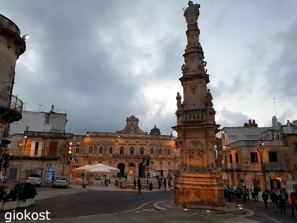 La sua denominazione di città bianca deriva dal fatto che le abitazioni furono imbiancate fino al tetto con la calce che bloccò il contagio della peste del XVII secolo, ancora oggi quest’usanza la rende così tipica ed affascinante tanto da attirare molti turisti. Visitare il centro storico è come immergersi in un percorso ricco di stili tra il gotico e il barocco leccese riscontrabile soprattutto nelle facciate delle chiese che si alternano con i settecenteschi palazzi e portali dallo stile rococò. Il monumento che rappresenta simbolicamente la città è però la colonna di Sant’Oronzo, alta venti metri, barocca, sulla cui sommità svetta il Santo benedicente ai livelli inferiori le statue di altri santi, Biagio, Irene, Gaetano e Lucia.