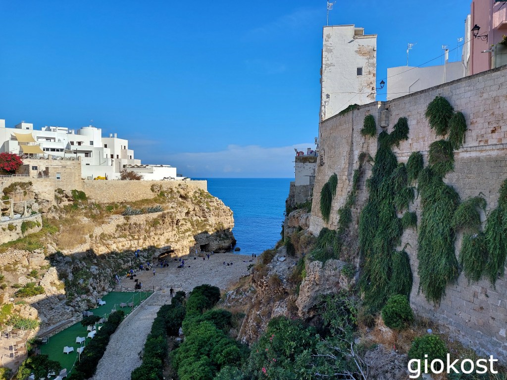 Polignano a Mare, paese molto antico anche se non ci sono date certe della sua fondazione sono state rilevate tracce del periodo neolitico e dell’età del bronzo, per attraversare l’Impero Bizantino la dominazione Veneziana e quella aragonese, ma solamente verso la fine del milleottocento si fregiò del nome di Polignano a Mare. La sua fama mondiale è dovuta al fatto che ha dato i natali a Domenico Modugno, ricordato da una statua in bronzo altra tre metri. Cosa vedere ancora? Il centro storico, per arrivarci si deve oltrepassare la porta che divide Polignano moderna da quella storica, ovvero l’Arco Marchesale, che è un residuo dell’antica cinta muraria della metà del millecinquecento. Una volta superato ci inoltriamo in un dedalo di stretti vicoli e piazzette che terminano in angoli con paesaggi meravigliosi o che si inerpicano con scale a volte arricchite da versi poetici di Guido il Flaneur. In una di queste precisamente piazza Vittorio Emanuele II si trova la cattedrale, dedicata a Santa Maria Assunta, una chiesa della fine del milleduecento che in origine era stata costruita in stile romanico che è andato pian piano quasi perduto viste le numerose trasformazioni subite negli anni. Degni di nota sono il campanile, ma soprattutto gli interni ricchi di opere come ad esempio il pulito e un polittico rappresentante la Madonna con Bambino. Nella stessa piazza si erge anche il Palazzo dell’orologio con la sua torre dove è alloggiato un orologio funzionante che si carica ancora in modo manuale.