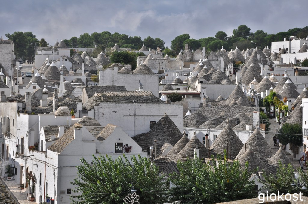 Alberobello, famosissima, anche troppo, almeno a mio parere, per i trulli. Dal punto di vista turistico un vero e proprio assalto all’acquisto di ricordi di vario genere principalmente nel Rione Monti, dove si raccoglie la maggior parte dei trulli non più abitati, percorrendo via Monte San Michele e via Monte Pertica, una contrada in salita che termina nel piazzale della Parrocchia Sant’Antonio di Padova, la famosa chiesa a Trullo.