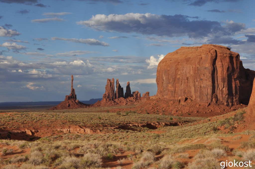 I punti panoramici sono molti, ma i più famosi sono il John Ford Point, il più visitato e scenografico a tal punto da essere “sfruttato” per farsi fotografare a cavallo per pochi dollari; il Three Sister tre pinnacoli che si distinguono per la loro sottigliezza; the Mittens and Merrick’s Butte, la classica foto appena arrivati nel parcheggio; the Elephant Butte, una classica conformazione a forma di elefante; l’Artist’s Point, una terrazza con vista panoramica della Monument Valley a dir poco strepitosa; il Totem Pole, il più bello, quello che mi ha affascinato maggiormente, un residuo di un butte, quindi un alto e sottilissimo pinnacolo di roccia attorniato da un altro gruppo di queste guglie chiamato Yei Bi Chei, divinità dei Navajo; infine la Rain God Mesa, un misto di sabbia, sassi, archi e pinnacoli che assomigliano ad una fortezza, il centro geografico del parco, qui i nativi pregano il Dio della pioggia. Ovviamente ce ne sono molti altri, in tutto sono ventisette tutti diversi tra loro chiaramente senza dimenticarsi del Forrest Gump Point, sulla US 163 Scenic Drive. Attenzione al fuso orario perché qui si applica l’ora legale a differenza di tutto lo stato dell’Arizona.