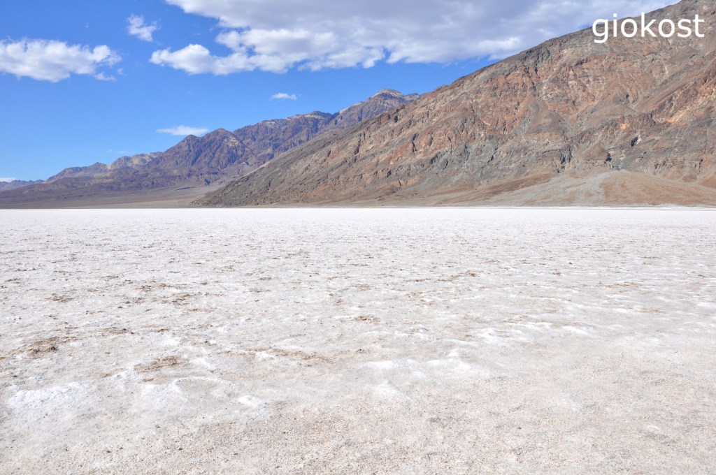 Proseguendo oltre in dieci minuti si raggiunge Fornace Creek, dove si trova un Visitor Center che ha due utilità una informativa l’altra di ristoro all’ombra. Ormai è diventato un luogo turistico con campeggi, resort e campo da golf. A poco più di quindici miglia da Fornace Creek circa mezz’ora di viaggio, al punto più basso dell’intero parco e del Nord America, 86 metri sotto il livello del mare, indicata con la scritta “Sea LEVEL” da un cartello sulla parete rocciosa sovrastante, il Badwater Basin. Anticamente era un vasto bacino d’acqua, dal parcheggio attraverso una passerella si arriva su questa distesa di sale, dalle caratteristiche figure geometriche, su cui si può passeggiare addentrandosi per qualche miglio, facendo attenzione a non rompere queste fragili strutture. Un altro cartello ci racconta l’origine del nome, il mulo di un viaggiatore non volle dissetarsi con l’acqua di quel lago appunto perché troppo salata e perciò cattiva.