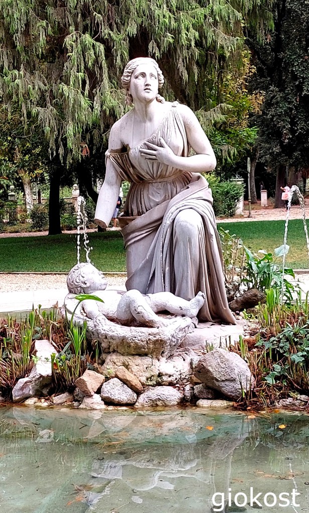 Proseguendo in direzione dell’Orologio ad acqua, lungo la passeggiata del Pincio incontriamo la fontana del Mosè salvato dalle acque. La fontana, in asse con il belvedere, un grande bacino di forma circolare con al centro una figura femminile che raccoglie un bambino dal cesto che dovrebbe essere circondato da una vegetazione di piante di papiro, quando ci sono stato non c’era nulla di tutto questo, l’opera perde così di significato anche se in questo modo si apprezzano meglio gli zampilli d’acqua.