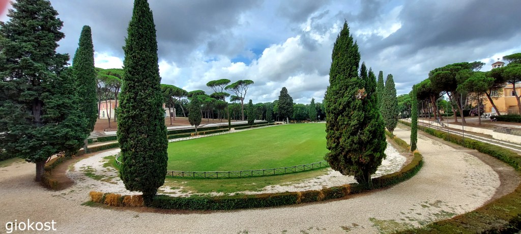 da quella posizione si scorge Piazza di Siena, un parco nel parco, deve il suo nome all’origine della famiglia Borghese originaria della città toscana. Sorse verso la fine del millesettecento in seno al progetto di riqualificazione della Villa Borghese come ispirazione di Piazza del Campo. Attorno al grande prato ci sono due costruzioni interessanti, la prima il Casino dell’Orologio, del millecinquecento, era la casa del giardiniere, ristrutturato due secoli dopo assunse la forma odierna, una bella rappresentazione dello stile neoclassico. La seconda è la Casina di Raffaello, oggi ludoteca e centro estivo con l’adiacente chiesa di Maria Immacolata.