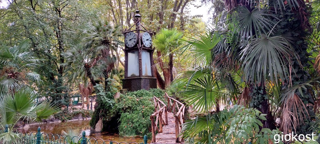 Continuando si arriva appunto a scorgere l’Orologio ad acqua, funzionante anche se con gli anni ha subito dei danneggiamenti. Si tratta di un idrocronometro montato su un basamento al centro di un piccolissimo specchio d’acqua, installato alla fine del milleottocento. Su ogni lato ci sono vetri da cui si evince il suo funzionamento, sopra un orologio a lancette, le ore sono indicate in numeri romani.