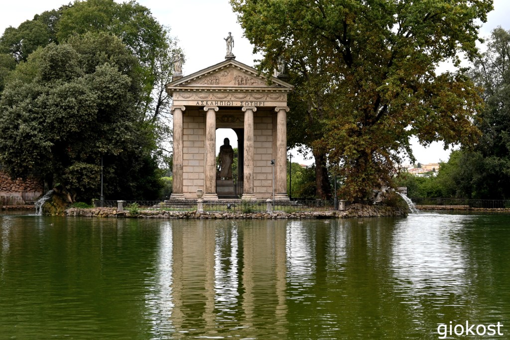 Tornando indietro fino a Piazzale delle Canestre e girando a sinistra lungo viale dell’Aranciera si giunge, passando davanti al Museo di arte moderna Carlo Billotti, al Tempio di Esculapio. Realizzato alla fine del millesettecento in stile neoclassico, è stato costruito su una piccola penisola artificiale che si affaccia sul Giardino del Lago. Dedicato al Dio della medicina lo ricorda con molti riferimenti. Il timpano, in particolar modo, rappresentando lo sbarco a Roma del serpente, animale sacro e simbolo arcaico della medicina ne è una prova inconfutabile. La facciata è costituita da quattro colonne con ai lati le statue di due ninfee, nascoste dalla vegetazione, che gettano acqua nel lago.
