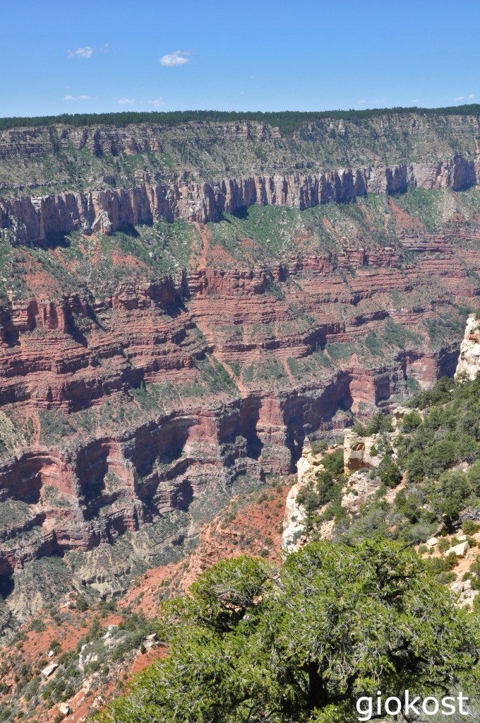 Iniziamo con il North Rim, il margine nord, situato a 2.700 metri sopra il livello del mare sull’altopiano di Kaibab, è più tranquillo dal punto di vista turistico perché meno conosciuto, chiuso nel periodo invernale, purtroppo, infatti è più alto e perciò le temperature sono diverse, più rigide, ma con un grande vantaggio, il silenzio, non ci sono bus navetta, grandiosi parcheggi e anche meno contaminazioni di qualsiasi tipo, ad esempio esiste un solo Lodge dove è possibile passare la notte.