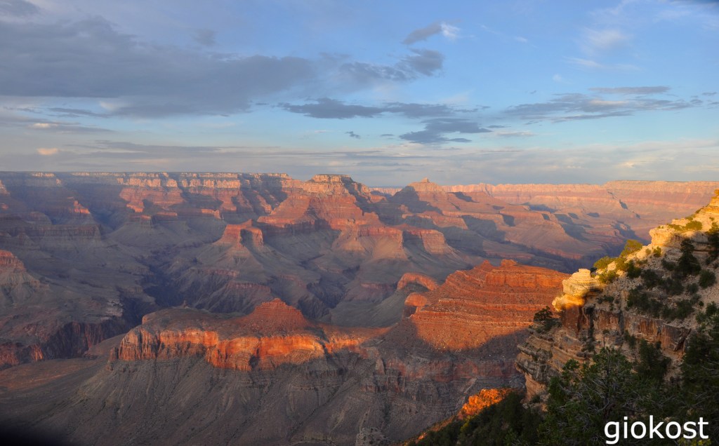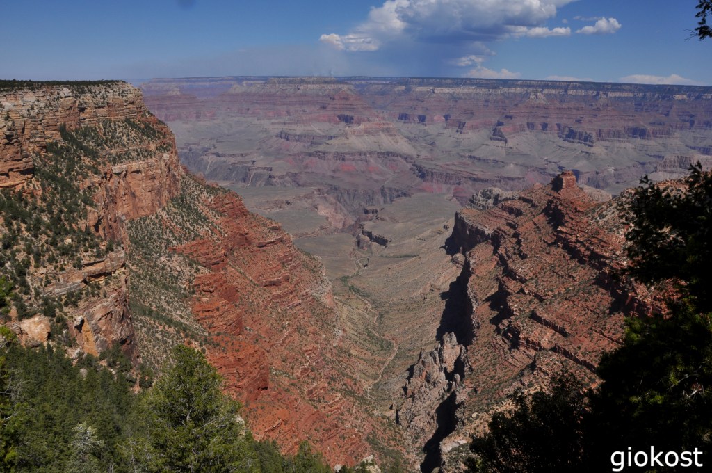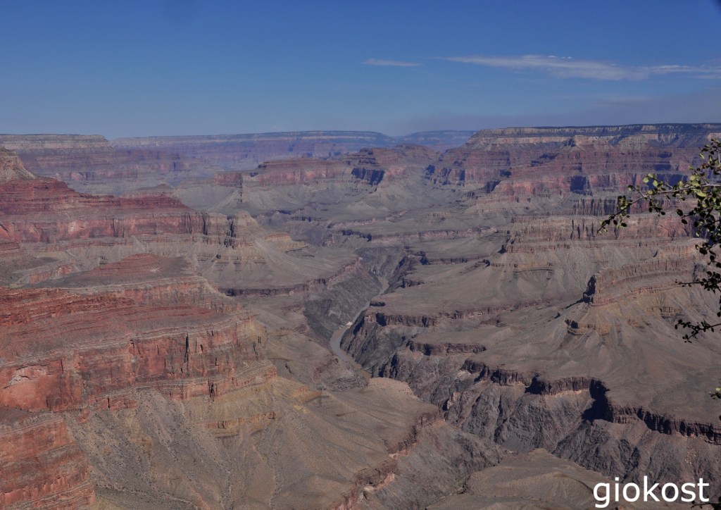Quali sono i punti migliori e più interessanti dove fermarsi per immortalare con una foto un panorama mozzafiato che cambia in continuazione secondo le ore della giornata? In questo tratto troviamo a seguire dopo il Desert View, oltre alle cosiddette aree picnic, alcuni punti panoramici interessanti come Lipan Point, scenografico perché permette un’ampia vista a 180°, ma soprattutto è visibile la Hance Rapid, una delle rapide più lunghe ed impegnative del fiume Colorado, volendo a poca distanza sorge il Tusayan Ruin and Museum che non ho visitato. A seguire consiglio è di fermarsi in almeno un altro punto, il Moran Point, da qui si osservano le tre diverse stratificazione delle rocce riconoscibili dalle differenti colorazioni, dalle verdastre più profonde alle biancastre più superficiali a cui si interpongono quelle colorate di rosso. In verità ce ne sono altri, Navajo Point, il punto più alto di tutto il canyon o il Grandview Point, da dove si vedono alcune anse del fiume, da qui parte anche il sentiero denominato appunto Grandview Trail ,stretto e ripido per cui adatto ad esperti, oppure il Pipe Creek Vista da dove parte il Rim Trail un sentieri, facile ed asfaltato che in 13 miglia arriva fino a Hermits Rest. L’unico punto non accessibile con l’auto sulla Desert View Drive è Yaki Point, perciò è necessario prendere la navetta del percorso arancione.