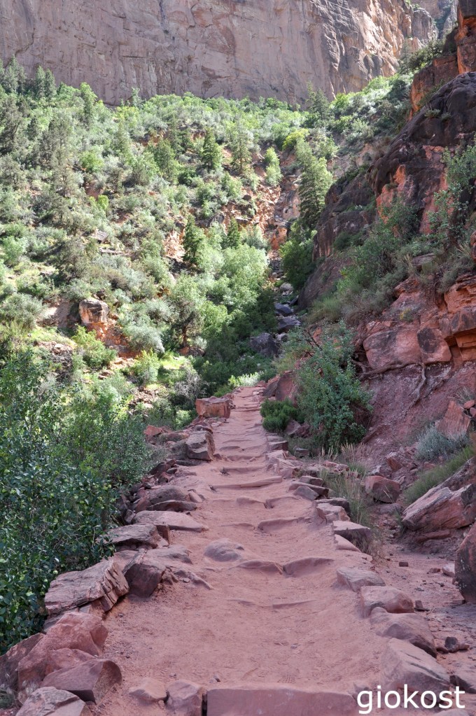 I sentieri portano giù fino alle sponde del fiume Colorado, il più popolare è senza alcun dubbio il Bright Angel Trailhead, lungo tredici chilometri, non molto difficile da percorrere perché ben tenuto, si incunea tra una faglia del canyon e perciò offre panorami completamente diversi da quelli visibili dai punti di osservazione di superficie. Io ho percorso solo un tratto di questo sentiero, circa sei miglia andata e ritorno, sono quasi dieci chilometri, mi sono sentito quasi come un pioniere di altri tempi osservando quel panorama particolare di vita vegetale e animale che difficilmente si incontra sulla strada che scorre lungo tutto il Rim.
