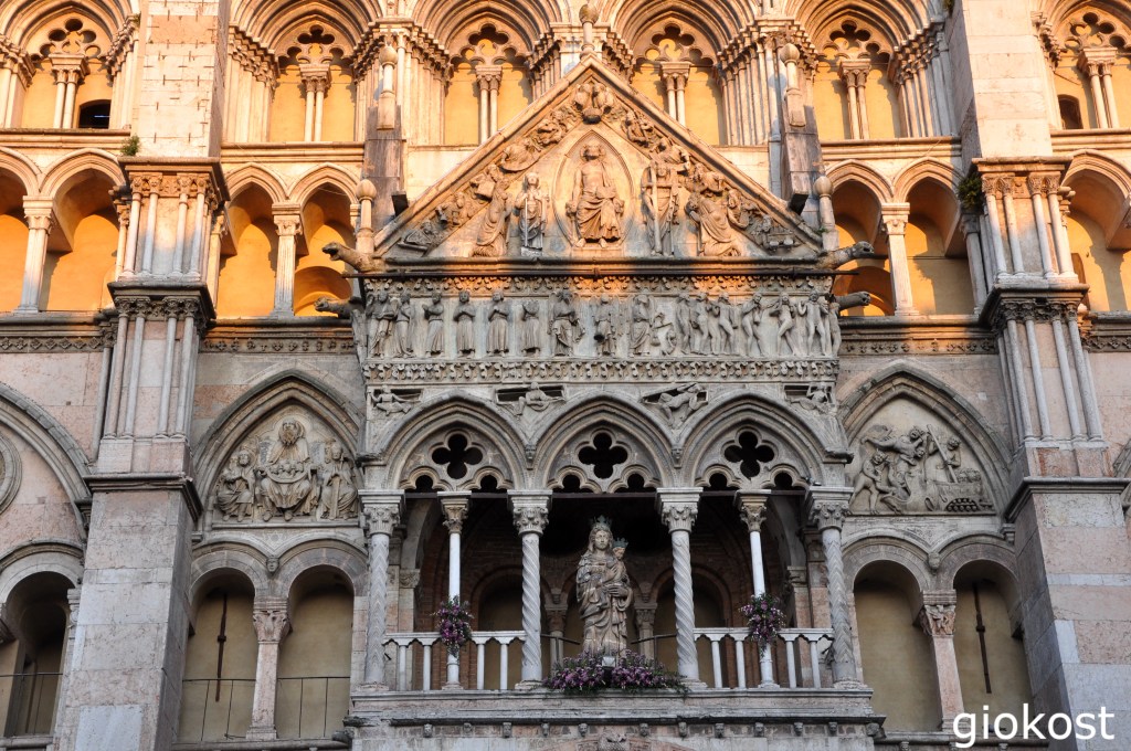 La sua costruzione fu inizialmente in stile romanico, lo si distingue molto bene nella parte inferiore per poi essere completata in stile gotico espresso nella sua parte superiore. Le logge, i piccoli archi, i rosoni e soprattutto la magnifica scultura del giudizio universale ne sono testimonianza. Sopra il portone d’ingresso si notano due lavori alcune scene del nuovo testamento e la statua di San Giorgio Protettore della città. Non sono entrato e per questo motivo non descrivo l’interno. Una nota spiacevole, con il terremoto del 2012 la basilica ha subito gravi danni. Sulla sua sinistra dopo il campanile, rinascimentale, direttamente sulla piazza, si ammira la Loggia dei Merciai, un lungo portico, una volta luogo di attività commerciali. Oggi sotto queste delicate colonne in marmo bianco, sormontate da capitelli scolpiti ognuno in maniera diversa si trovano negozi di vario tipo.