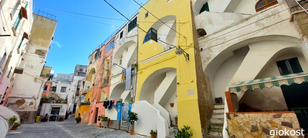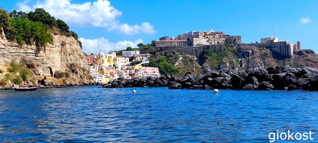 Per arrivare su quest’isola ho scelto il treno fino a Napoli Centrale, da lì al molo Beverello con la metropolitana scendendo alla stazione Municipio, poi un piccolo tratto a piedi passando in fianco al Castel Nuovo, il Maschio Angioino ed infine il traghetto o l’aliscafo per sbarcare al porto Marina di Procida. Camminando lungo Via Roma, costeggiando il mare sulla destra, si arriva in un piccolo spiazzo dove si trova l’infopoint e soprattutto il capolinea di tutti i bus che, in quel periodo, erano gratuiti in quanto nel 2022 era designata come capitale della cultura Italiana.