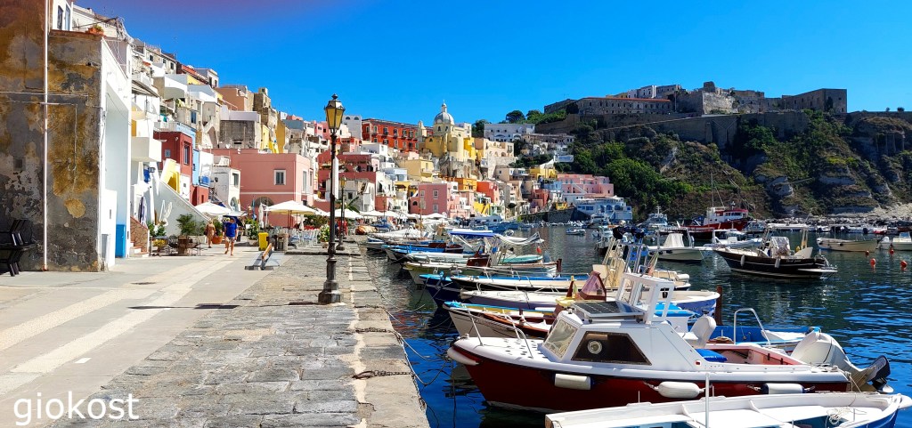 Allora cosa vedere e in quanto tempo? Stimare in assoluto quanti giorni rimanere a Procida per visitarla bene non è semplice, io ci sono rimasto tre giorni pieni e sono rimasto pienamente soddisfatto di quello che ho visitato che siano state le spiagge o altre attrazioni, però, ad incantarmi, è stata la combinazione tra divertimento, cultura e paesaggi che ho trovato. Arrivando al porto ci si presenta davanti Marina Grande, ci accoglie una coloratissima sintonia di case dai color pastello, cosicché i pescatori potessero riconoscere la loro abitazione anche da lontano. Tra loro spicca un edificio, Palazzo Montefusco, abbellito da una splendida merlatura del XII secolo che fu anche la residenza dei re. Oggi è il cuore pulsante dell’isola, infatti vi si trovano negozi, bar e ristoranti.