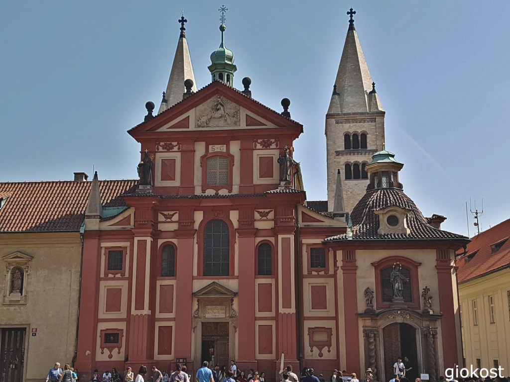 Uscendo siamo in vista della Basilica di San Giorgio, inizialmente una chiesa preromanica perciò molto antica, infatti venne costruita prima dell’anno mille, nel corso degli anni però ha subito diverse modifiche, come ad esempio l’aggiunta delle due torri chiamate una Adamo e l’altra Eva e pur mantenendo lo stile romanico iniziale si presenta con una facciata barocca, e internamente con alcuni elementi gotici. Il pezzo forte è sicuramente l’abside con i suoi affreschi datati XII secolo ma non bisogna dimenticare il portale riconoscibile per il bassorilievo con San Giorgio e il drago. In una cappella, seminascosta, sono conservati i resti della prima martire della Boemia, Santa Ludmilla.