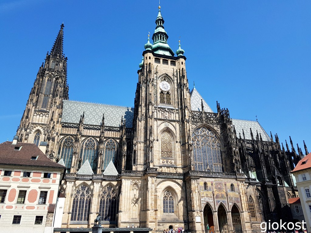 Costruita sulle rovine di due chiese precedenti, andate distrutte, nel XIV secolo in stile gotico, ma quello che si vede oggi è il frutto di molte traversie, soprattutto guerre, infatti, venne completata nel XIX secolo. La facciata presenta due campanili con una serie di pilastri adornati da statue di santi ed un rosone, sopra all’ingresso, raffigurante la creazione. Si entra attraversando un portone in bronzo con scene della costruzione della cattedrale stessa e leggende di San Venceslao. Sulla destra la torre campanaria alta un centinaio di metri. Vi si può salire “scalando” quasi trecento gradini, lungo il percorso oltre alla vista sull’intera città si incontrano le campane tra cui quella chiamata Sigismondo, la più grande di Praga.