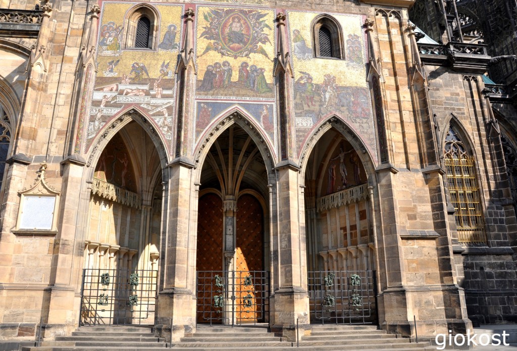 Dal bellissimo giardino, che contraddistingue la residenza estiva della regina Anna, attraversando Prašný Most, ovvero il Powder Bridge, che scavalca il fossato esterno, dove ad ogni cambio d’ora, si può vedere e fotografare il cambio della guardia, si entra nel Castello di Praga, costruito nel IX secolo su una delle alture caratteristiche della città boema di cui è diventato il simbolo. In realtà ci sono altre due entrate oltre a questa. Una secondaria che di solito è l’uscita dal castello in quanto contigua al vicolo d’Oro, da cui si ha una bellissima vista sul quartiere di Mala Strana. La principale, o meglio quella ufficiale, è la Hradčanské náměstí, ovvero la Porta dei Giganti, sopra le garitte delle guardie, ai lati della cancellata, barocca in ferro battuto, si vedono due titani che lottano e attraversandola si entra nella prima corte dove, ogni ora, avviene il cambio della guardia. qui attraverso Matyášova brána, la porta di Mattia, si arriva alla seconda corte che spesso si oltrepassa per entrare nella terza corte, da qui si inizia di solito la visita, perché ci si trova subito davanti alla Cattedrale di San Vito e immediatamente si viene investiti dalla sua vastità e dalla storia. Questa chiesa, simbolo della città, è la più grande ed importante di Praga e una delle più grandi d’Europa. Qui si incoronavano i re ed è tutt’ora il luogo dove sono conservate le spoglie di molti principi, re, vescovi e persone storiche.
