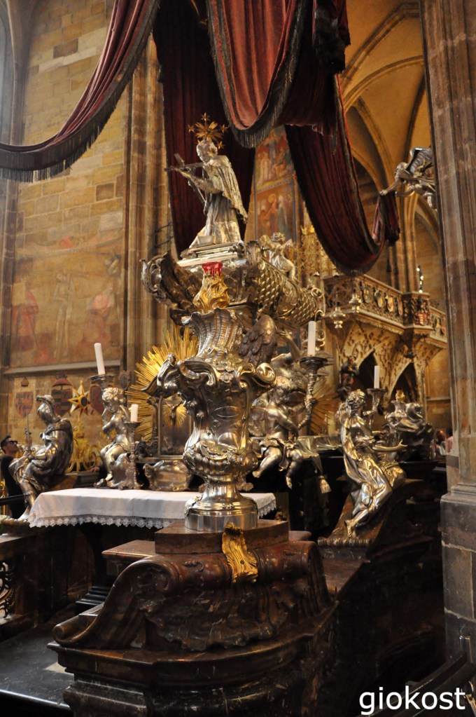 Altra opera stupenda è l’altare maggiore, anch’esso barocco, la sua altezza è impressionante, infatti si sviluppa su tre piani, scuro per cui risaltano gli elementi decorativi, statue quadri e stemmi tra i quali quello del benefattore riconoscibile perché inserito tra due putti. Le due navate laterali inoltre, sono collegate tra loro da molte cappelle che continuano anche dietro all’altare maggiore, tutte con altari datati prima metà del XVIII secolo. Tra queste troviamo la tomba d’argento di Giovanni Nepomuceno. In stile barocco, impressionante, facilmente riconoscibile per la sua imponenza, per lo splendore dell’argento che la connota e per il baldacchino con drappi rossi che la racchiude.