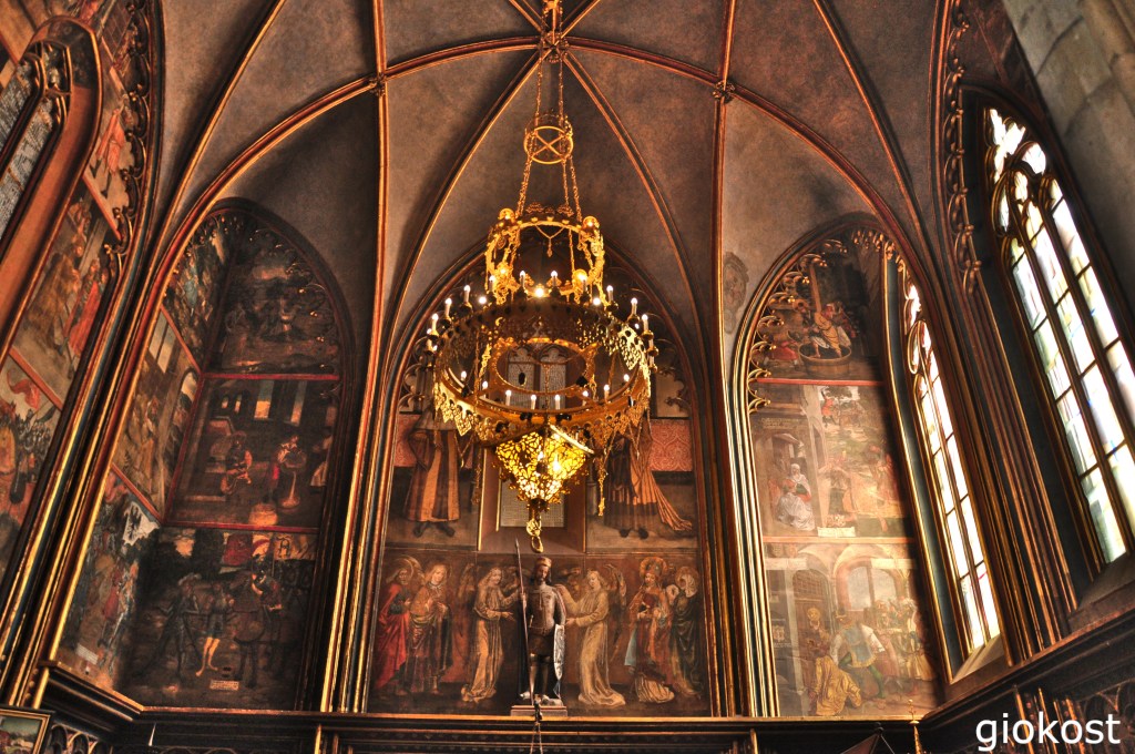 La più nota, però, è quella di San Venceslao, sicuramente la più bella e ricca di opere d’arte come gli affreschi del IV secolo che raccontano la vita di Gesù. Al centro, sotto una volta a stella, troviamo la tomba del santo eretta, in stile gotico, nel XIV secolo ornata da pietre preziose, sopra di essa sono custodite le reliquie del santo. Tutte le pareti sono addobbate con pitture del VI secolo che ricordano la vita di questo santo. Osservando con attenzione la cappella si scopre che in un angolo c’è una piccola porta che una volta ogni otto anni viene aperta e ci fa entrare nella camera della corona dove sono custoditi i gioielli reali.