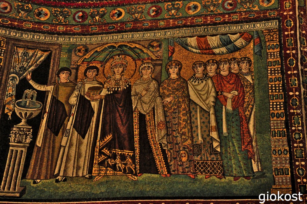 Osservando le parti inferiori delle pareti si rimane attoniti davanti al cosiddetto Corteo di Teodora e Giustiniano. L’imperatore è al centro del mosaico, riconoscibile dall’areola, la sua figura a quel tempo era molto venerata, avvolto in un abito di porpora, e in mano tiene un catino d’oro, tutt’attorno dei sacerdoti, uno è il vescovo di Ravenna Massimiano, lo dice la scritta sul suo capo, dei dignitari e degli uomini in armi. Di fronte l’imperatrice posta al centro del moscaio è rappresentata mentre porge un calice tempestato di pietre preziose, interessante è l’ornamento del viso di Teodora, il lusso che traspare dai vestiti delle dame che la circondano e lo sfondo, tutto da un’idea della magnificenza della corte di Bisanzio.