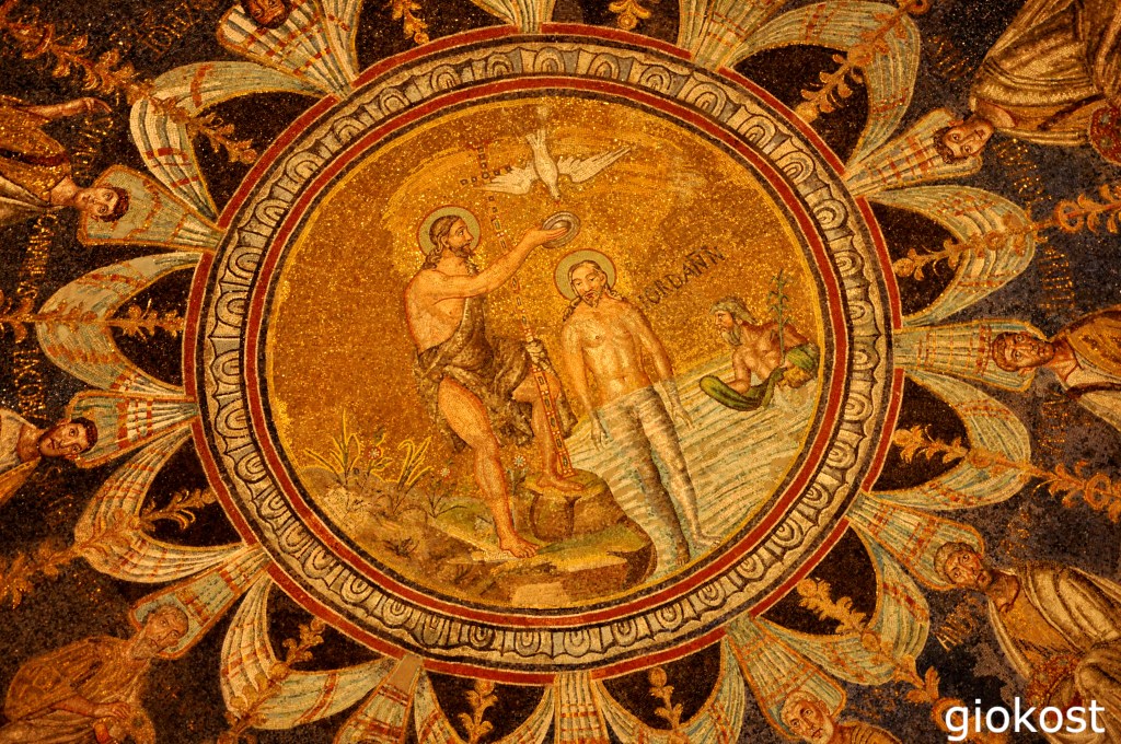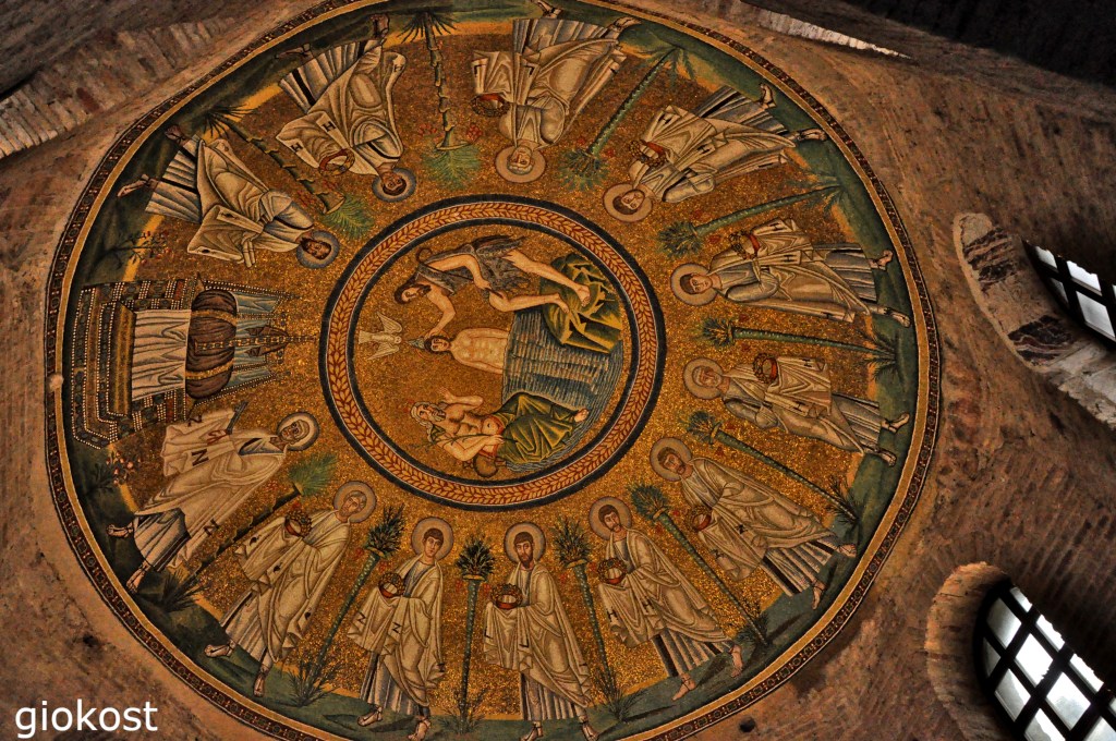Spostandoci verso piazza del Popolo dobbiamo fare una piccola deviazione per entrare nel Battistero degli Ariani ormai quasi nascosto dalle abitazioni del centro storico, è obbligatoria una visita. costruito da Teodorico nel Quattrocento d.C. in contrasto con il battistero neoniano o degli ortodossi di cui scriverò in seguito. Internamente è spoglio, infatti non c’è più traccia degli affreschi che ornavano le pareti. l’unica decorazione si trova sulla cupola. Il mosaico, circolare, al centro rappresenta il battesimo di Cristo nel Giordano ad opera di Giovanni Battista, a lato la personificazione del fiume stesso e sopra la colomba dello Spirito Santo. Attorno al medaglione centrale sono raffigurati gli apostoli che si dirigono verso un trono con sopra una croce con gemme. A destra si scorge San Pietro con le chiavi del Paradiso mentre a sinistra San Paolo tiene in mano i rotoli della Bibbia.