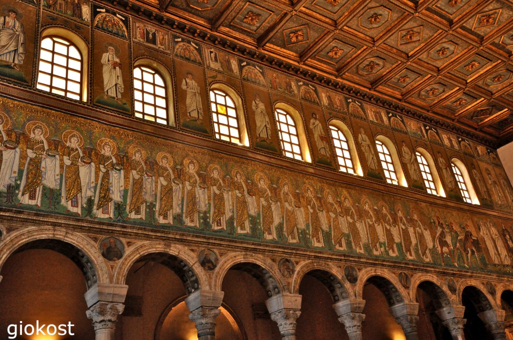 Da qui, arrivando in via Roma, dobbiamo assolutamente entrare nella Basilica di Sant’Apollinare Nuovo, da non confondere con Sant’Apollinare in Classe che si trova fuori dalla città e di cui scrivo in seguito. Fu fatta erigere da Teodorico nell’anno cinquecento e quindi inizialmente fu una chiesa per il culto ariano. Al di là della sua storia e della semplicità architettonica, tre navate senza transetto, quella mediana termina con l’abside, è famosa per i suoi mosaici, unici al mondo, che occupano tutta la navata centrale, la più larga, riconducibili o al periodo di dominazione ostrogota o a quello successivo quando la chiesa fu adibita al culto cristiano. Coloratissimi, divisi in tre strisce, partendo da quella superiore che descrive in riquadri la vita di Cristo, tratta dai Vangeli, a sinistra l’età giovanile, a destra quella della maturità. Le scene sono intervallate da riproduzioni decorative con colombe. Subito sotto, nella fascia mediana, tra le grandi finestre, si intervallano le raffigurazioni di santi, profeti e apostoli. Nella fascia inferiore, la più grande, ma anche la più manomessa nei secoli, a destra, vediamo il palazzo di Teodorico da cui parte una processione di Santi che si dirige verso Cristo assiso in trono circondato dagli arcangeli Michele, Gabriele, Raffaele ed Uriele.
