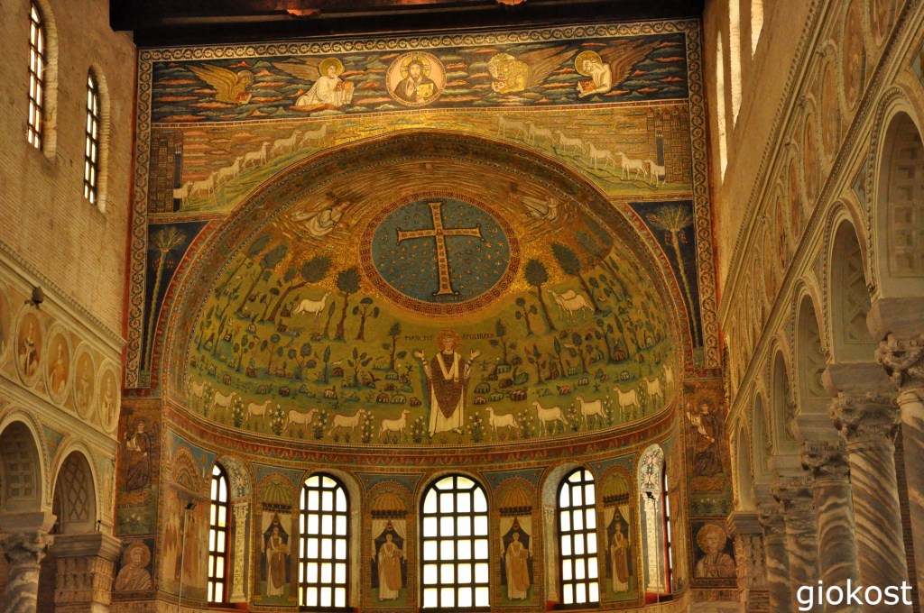 L’abside è decorata con un mosaico tra i più estesi a noi giunti, Nella parte superiore una croce dorata al centro di un cielo stellato di forma rotonda, guardando bene si nota che all’incrocio delle braccia della croce c’è la figura di Cristo, sopra dalle nuvole esce la mano di Dio, lateralmente due figure, sono il profeta Elia e Mosè, due personaggi molto importanti dell’antico Testamento, subito sotto, sempre in posizione laterale tre agnelli a richiamare tre apostoli, Pietro Paolo e Giovanni. La zona inferiore, verde e ricca di fiori troviamo, al centro Sant’Apollinare, con le braccia aperte come a richiedere la grazia per i suoi fedeli raffigurati sotto da dodici agnelli. Alzando ancora lo sguardo, sull’arco sopra l’abside, al centro, ammiriamo Cristo benedicente con ai lati i simboli dei quattro evangelisti. Immediatamente sotto, intervallati dalle finestre, quattro vescovi, Ursicino, Orso, Severo ed Ecclesio, coloro che fondarono le principali basiliche di Ravenna. A lato dell’abside ci sono due pannelli datati VII secolo con rappresentati, a destra, tre figure del libro della Genesi, precisamente Abramo, Abele e Melchisedec intenti ad offrire sacrifici a Dio, a sinistra, l’imperatore Costantino. La navata centrale è separata dalle due laterali da un colonnato sopra il quale si notano i ritratti di molti vescovi di Ravenna, mentre lungo le pareti delle navate laterali ci sono dei sarcofaghi in stili diversi che vanno dal V al VIII secolo cioè dall’età romana fino al bizantino.