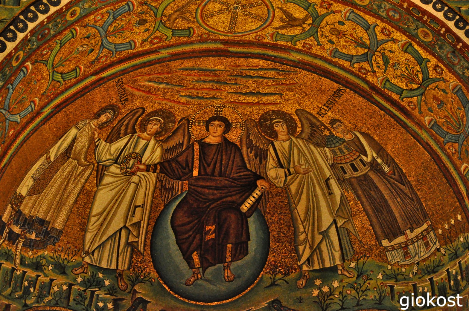 Da qui, arrivando in via Roma, dobbiamo assolutamente entrare nella Basilica di Sant’Apollinare Nuovo, da non confondere con Sant’Apollinare in Classe che si trova fuori dalla città e di cui scrivo in seguito. Fu fatta erigere da Teodorico nell’anno cinquecento e quindi inizialmente fu una chiesa per il culto ariano. Al di là della sua storia e della semplicità architettonica, tre navate senza transetto, quella mediana termina con l’abside, è famosa per i suoi mosaici, unici al mondo, che occupano tutta la navata centrale, la più larga, riconducibili o al periodo di dominazione ostrogota o a quello successivo quando la chiesa fu adibita al culto cristiano. Coloratissimi, divisi in tre strisce, partendo da quella superiore che descrive in riquadri la vita di Cristo, tratta dai Vangeli, a sinistra l’età giovanile, a destra quella della maturità. Le scene sono intervallate da riproduzioni decorative con colombe. Subito sotto, nella fascia mediana, tra le grandi finestre, si intervallano le raffigurazioni di santi, profeti e apostoli. Nella fascia inferiore, la più grande, ma anche la più manomessa nei secoli, a destra, vediamo il palazzo di Teodorico da cui parte una processione di Santi che si dirige verso Cristo assiso in trono circondato dagli arcangeli Michele, Gabriele, Raffaele ed Uriele.