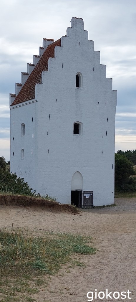Ancora prima, svoltando sulla sinistra si entra nel parcheggio da dove raggiungere Den Tilsandede Kirke, la chiesa sepolta, dedicata a San Lorenzo, costruita nel milletrecento, in stile gotico baltico, venne chiusa nel 1795 perché non era più possibile proteggerla dalla sabbia trasportata dal vento che nel corso dei secoli ha ricoperto il cimitero e la chiesa. Quello che rimane visibile oggi è il campanile del XV secolo restaurato nel milleottocento e dipinto di bianco. Salendo una stretta scalala chiocciola si riesce a salire ai piani superiori da dove si ha una bella vista sul territorio attiguo.