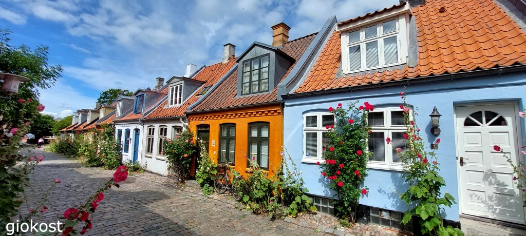 Di passaggio, per arrivare a questo museo, il municipio dall’architettura unica, funzionalista danese, costruito nella metà del XX secolo, riconoscibile per la torre, alta sessanta metri con un l’orologio, funzionante, dal diametro di sette metri, circondato da un incantevole piccolo parco. A poca distanza, non più di quattrocento metri, proprio nel centro della città troviamo Mølleparken e subito al suo limitare Møllestien, una vecchia stradina dell’età vichinga, acciottolata con ai lati case, del XVIII secolo, quasi tutte ad un piano, dai colori sgargianti, erette nel millesettecento ornate da malvarose, la prima impressione? Tornare indietro nel tempo e respirare un’ aria fiabesca.