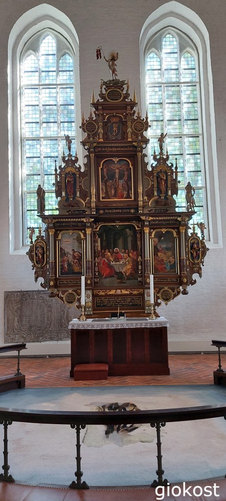 da cui, dopo aver salto più o meno trecento gradini, si ha una vista completa della città, con la palude si guardiamo verso ovest, con il Mare di Wadden e il sistema fluviale verso est e dell’abbassamento del pavimento originale. Con l’avvento del luteranesimo la chiesa venne abbandonata, l’interno dipinto per coprire gli affreschi e le statue rimosse. Con gli ultimi restauri si è cercato di riportare alle origini questa meraviglia. Internamente si osservano ancora alcuni reperti come, l’organo del milleseicento, un dipinto della Vergine Maria con Gesù Bambino, su un pilastro della navata centrale, il pulpito rinascimentale, la raffigurazione di S. Giorgio e il drago, la fonte battesimale in bronzo, alcuni epitaffi tra cui uno del XII secolo e delle lapidi di personaggi importanti.