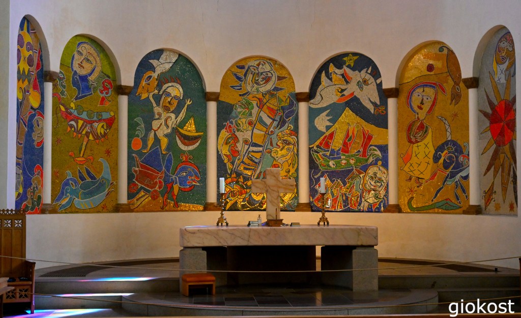 Quello che attira immediatamente l’attenzione sono però i dipinti e i mosaici, anche in vetro, del XX secolo, che ornano il coro, coloratissimi sono una particolare spiegazione di alcune scene bibliche fornite dall’artista Carl-Henning Pedersen (la foto ne è un particolare). Esternamente, oltre alla torre descritta in precedenza, detta anche Torre di Ribe, al di là del portale principale, se ne innalza un’altra, la Mariatornet leggermente più bassa anche più antica della precedente, in realtà ne esiste un’altra che si eleva sopra l’apside del coro.