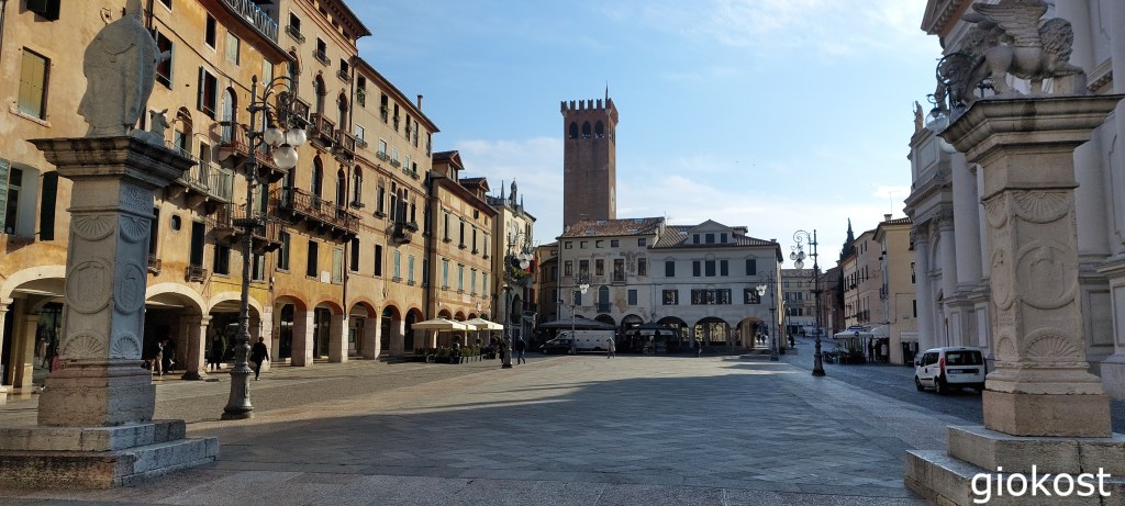 A questo punto abbiamo due opzioni, la prima è imboccare via Portici Lunghi per entrare in Piazza Libertà, dalla seconda guerra mondiale, infatti nel tempo ha cambiato diversi nomi. Entrandovi si notano immediatamente le due colonne con il leone di San Marco, a destra e quella di San Bassano a sinistra. Sul lato destro troviamo la chiesa di San Giovanni Battista. Eretta nel XIV secolo oggi si presenta, dopo varie ristrutturazioni, come dopo quella avvenuta nel XVIII secolo con una struttura particolare, più larga che alta. La facciata, grandiosa, in perfetto stile palladiano presenta quattro colonne centrali ai cui lati si aggiungono. sul frontone e sulle ali del tetto, le statue di diversi santi tra cui appunto San Giovanni Battista. L’interno si sviluppa in senso longitudinale per questo l’altare maggiore non è di fronte all’entrata, ma alla sua sinistra dove si apre anche la Cappella del Sacramento con la pala d’altare di Giambattista Piazzetta raffigurante San Giovanni Battista da giovane.