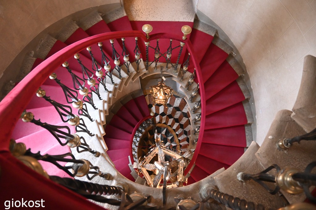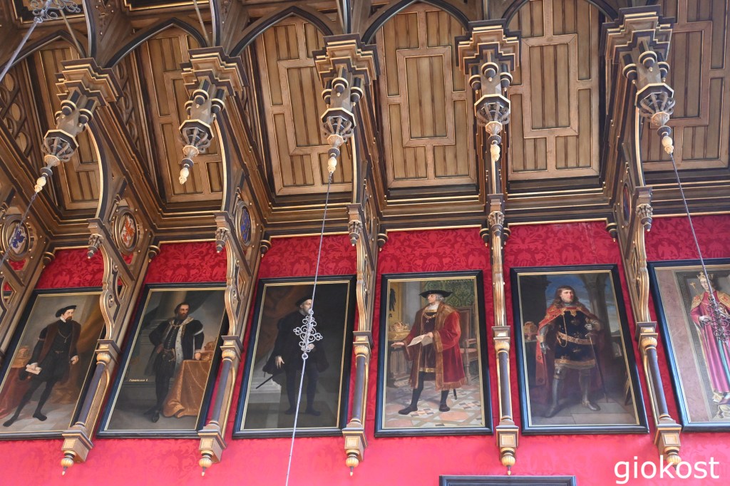 Per salire al primo piano, destinato piano alla rappresentanza, si passa attraverso l’atrio d’onore, l’ingresso al Castello, scenografico, realizzato per celebrare la dinastia degli Asburgo, infatti, sia di fronte che ai lati dello scalone che conduce al piano superiore così come sopra le porte d’entrata al pian terreno, ci sono dipinti i ritratti della casa regnante e dei suoi avi, sulle pareti trofei di caccia e due armature datate XV secolo. Al primo piano tutte le stanze sono decorate con stoffa rossa abbellite con il monogramma e la corona imperiale, le sale di maggior impatto sono sicuramente la prima che si incontra la sala dei Regnanti dove alloggiavano gli ospiti, alle pareti i ritratti dei sovrani della stessa epoca di Massimiliano, di grande impatto è il letto dono di Napoleone III.