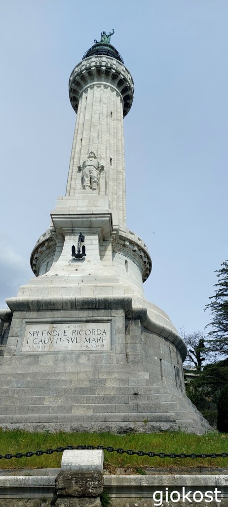 Prima di arrivare in città è quasi doveroso fare una scappata al Faro della Vittoria, alto circa setta metri, venne eretto sul poggio di Gretta, un quartiere di Trieste, verso la metà del millenovecento in sostituzione della vecchia lanterna ormai non più adatta per la sicurezza della navigazione portuale. Oltre alla sua funzione di faro è anche un monumento per ricordare i caduti della prima guerra mondiale. Sul basamento c’è un ancora, si dice dell’Audace anche se in verità è della nave gemella Berenice e sopra, alla base della colonna un marinaio che scruta il mare. Appena sotto un’epigrafe che ricorda i caduti in mare, il tutto è cinto da una catena con due proiettili all’entrata. Sopra la lampada si erge la vittoria alata che stringe l’alloro con la mano destra e una fiaccola con la sinistra. Da quassù, oltre alle raffiche di vento si ha una bellissima vista sull’intera città.