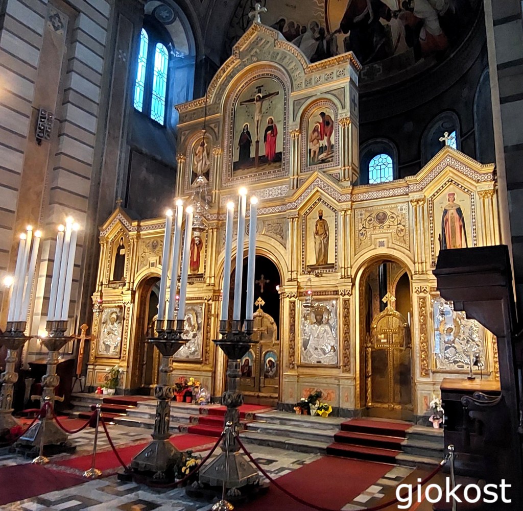 L’interno è spettacolare con le sue pitture absidali con uno sfondo dorato, ad olio, sembrano mosaici, che raffigurano in quella principale Cristo con gli apostoli, in quella a sinistra il concilio di Nicea, in quella a destra l’assunzione della Vergine Maria e sulla cupola il Cristo Pantocratore. Bellissima anche l’iconostasi, una parete divisoria tra la navata e il luogo di celebrazione, con, in basso, quattro icone, ricoperte d’oro, eseguite in Russia nel XIX secolo, raffiguranti S. Spiridione, la Madonna con Bambino, il Cristo Re, l’Annunciazione, di pregio anche la lampada votiva che pende all’ingresso regalo di Paolo I zar di Russia.