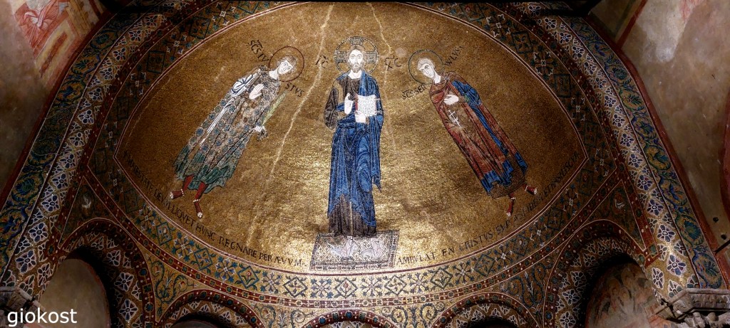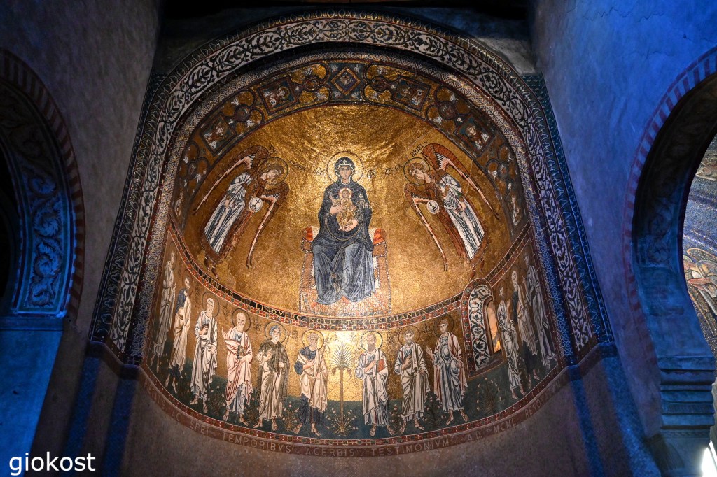 L’interno è stupefacente, la navata centrale termina con l’abside dove un mosaico del 1932 raffigura l’incoronazione della Vergine e tutt’attorno martiri triestini e angeli. Sono soprattutto le due absidi laterali che però lasciano a bocca aperta. Entrambe ornate con mosaici del XII secolo, quella a sinistra dove viene rappresentata la Vergine con il bambino benedicente, seduta in trono con gli arcangeli Michele e Gabriele in preghiera, sotto compaiono gli apostoli. Nell’altra abside, a destra, in questo mosaico del secolo seguente, ammiriamo il Cristo Pantocratore su uno sfondo dorato, con a fianco i santi Giusto e Servolo, sotto, incorniciato da colonne, otto affreschi del XIV secolo che raccontano la vita di San Giusto. Ancora più a destra un’altra abside con un affresco che ritrae la croce con gemme tra due santi.