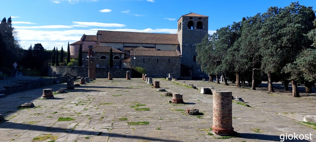 Qui siamo sulla sommità del colle, dove vennero edificati gli edifici di maggior pregio della Tergeste romana. qui troviamo, sullo spiazzo dinanzi alla salita che porta al castello, quello che rimane del foro romano, con i resti di una basilica civile romana, a tre navate, di cui rimangono due file delle base delle colonne, alcune ancora con i capitelli e le rovine dei propilei, inglobati nel campanile della cattedrale.