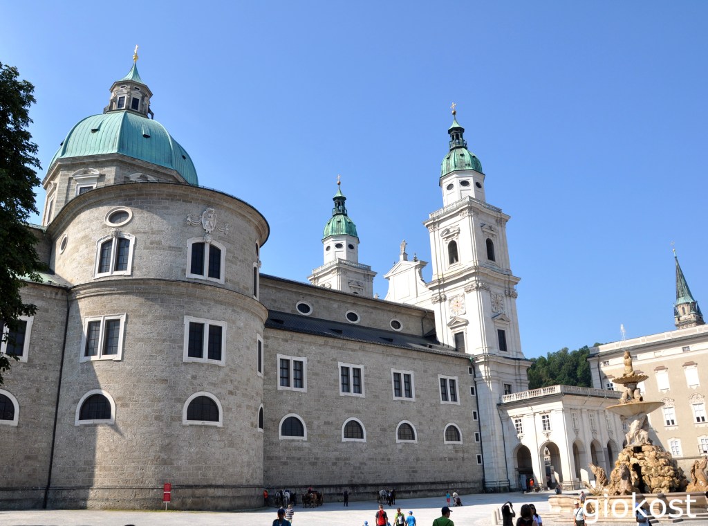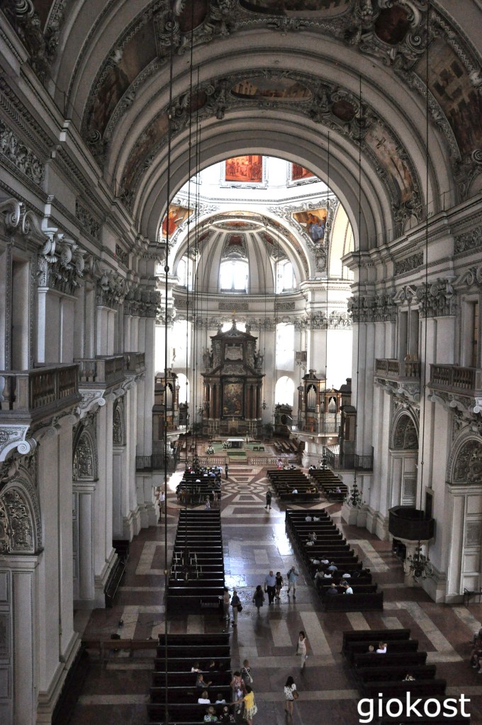 Attigua c’è la Domplatz, dove si staglia la Mariensäule ovvero la colonna di Maria Immacolata, rappresentata sulle nuvole con ai lati delle figure allegoriche. Sulla piazza si staglia anche l’imponente facciata del Duomo, con le sue due torri gemelle e la grande cupola ricostruita dopo la guerra. Consacrato ai Santi Ruperto e Virgilio, è la cattedrale cattolica della città, perciò già osservando l’esterno, che domina tre piazze si capisce la sontuosità che ci attende. Eretto già nel ottavo secolo, in stile romanico, ha subito molte variazioni con il passare del tempo, infatti, a causa di due incendi venne ricostruito ed ampliato dapprima nella metà del millecento, poi alla fine del millecinquecento, in stile barocco, infine non venne risparmiato neanche dalle bombe della seconda guerra mondiale, per fortuna venne distrutta e ricostruita solo la cupola. Esternamente presenta un imponente facciata bianca e si notano immediatamente le due alte torri campanarie dove al secondo ordine ci sono un orologio e le quattro statue dei santi Paolo, Pietro, Ruperto e Virgilio, poste lateralmente ai tre portali in bronzo di ingresso che ricordano le virtù divine, fede, speranza e amore.