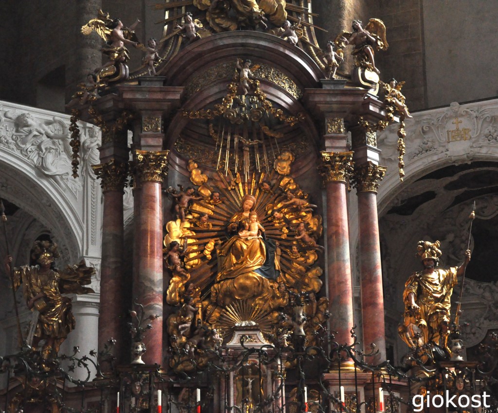 Accanto al Duomo si erge la Kollegienkirche, è la chiesa universitaria, anche se ha cambiato ruolo durante i secoli, ultimata all’inizio del XVIII secolo, internamente domina la cupola alta una sessantina di metri e il bianco che mette in risalto, pervaso dalla luce che filtra da grandi finestre, gli stucchi che arricchiscono la chiesa, non ci sono affreschi. L’altare maggiore, in marmo rosso, è particolare, infatti, si slancia verso l’alto presentando a centro il tabernacolo riccamente ornato da putti, dietro sette colonne che sorreggono una struttura che termina con le statue di sette angeli, sopra di esso un meraviglioso stucco della Madonna su una falce di luna in oro posta all’interno di un’areola di raggi anch’essi in oro circondata da un’infinità di angeli giubilanti in un tripudio di nuvole.